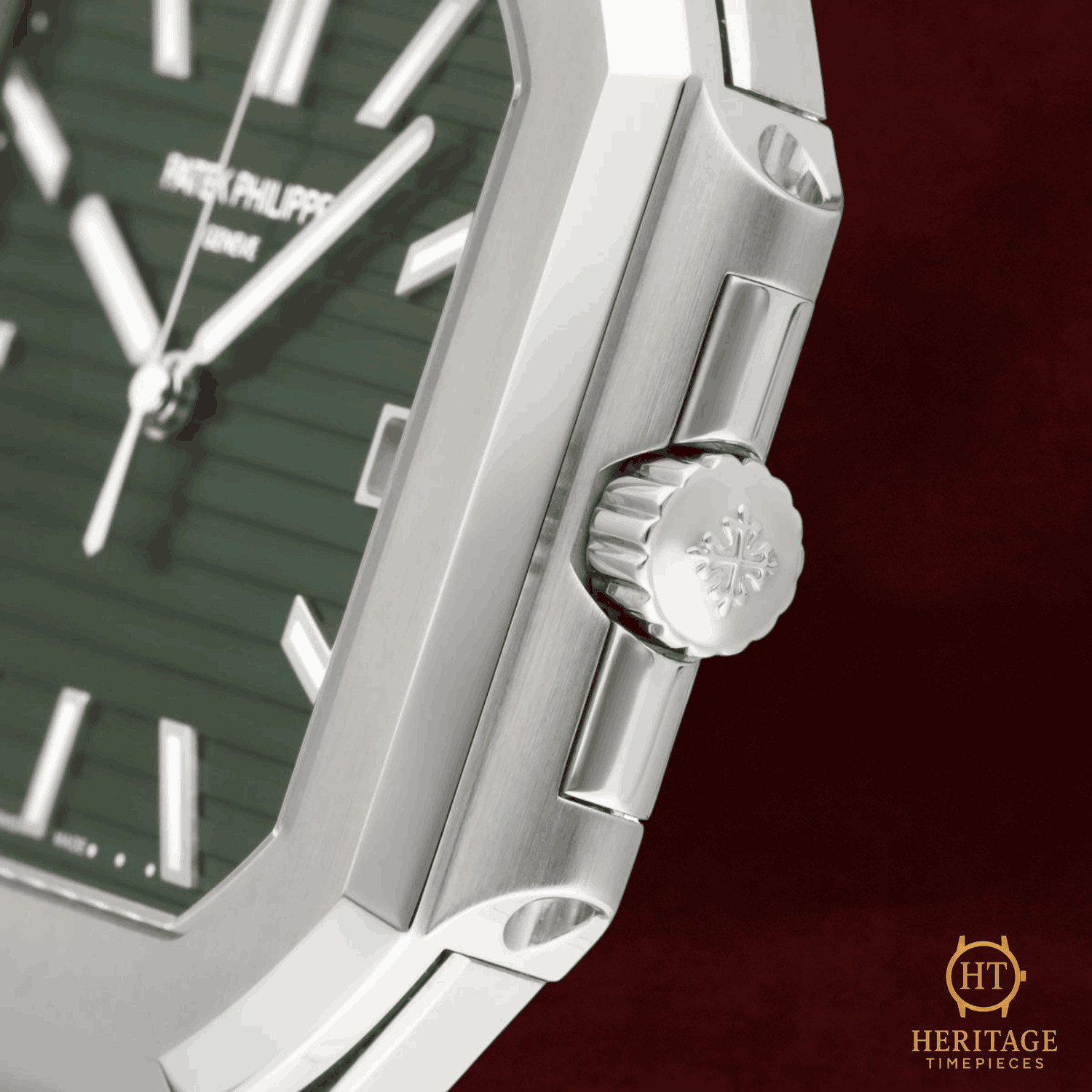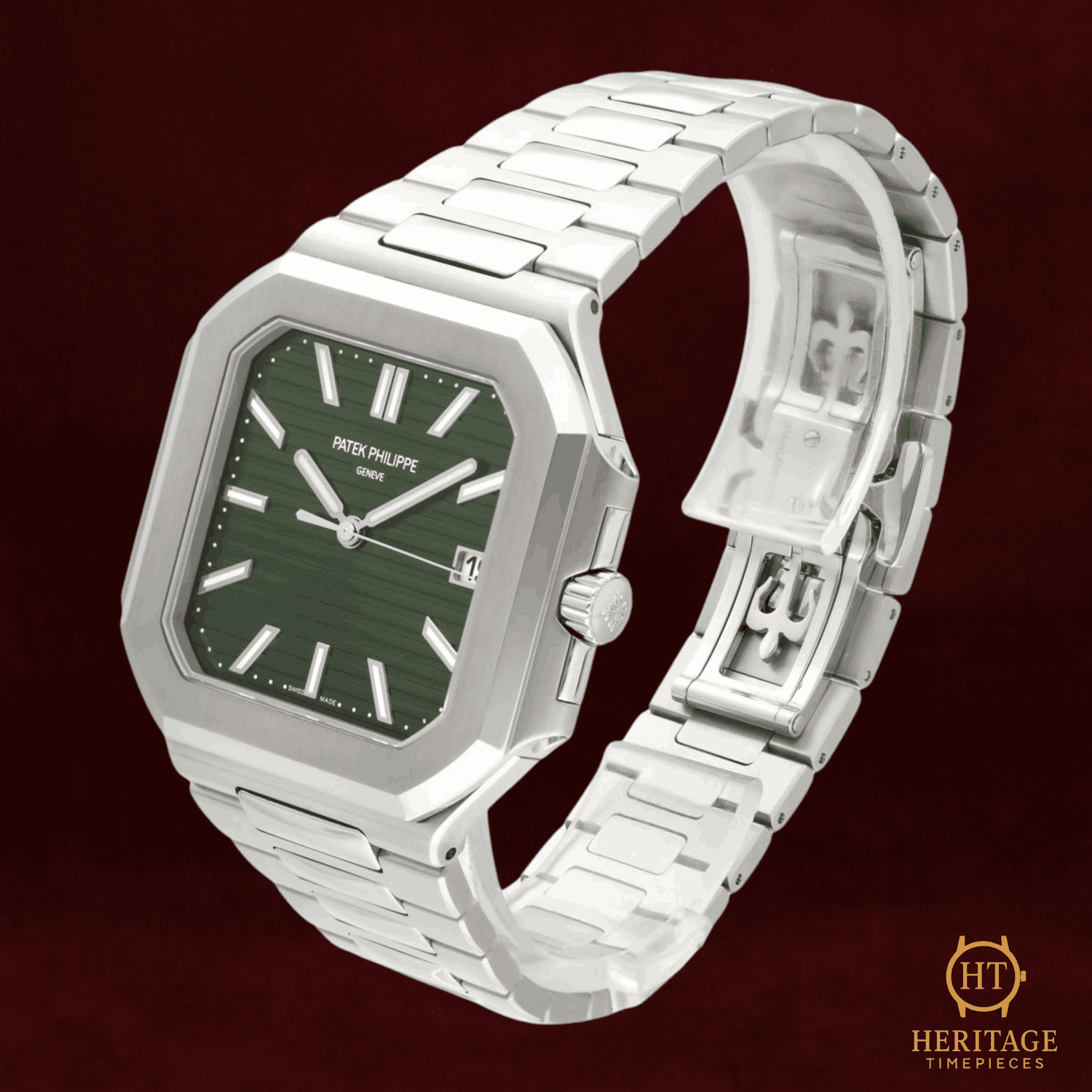 Heritage Narrative The Patek Philippe Cubitus reference 5821/1A-001 represents a contemporary stainless steel sports watch concept from one of watchmaking’s most historically respected maisons. With its bold 45 mm case size and integrated bracelet design, the Cubitus line introduces a distinctly modern silhouette, pairing Patek Philippe’s traditional finishing standards with a more architectural and assertive wrist presence. This example from 2024 is presented new and offered as a full set. The watch features a green dial with a clean, minimalist layout and applied luminous indices, delivering strong legibility while maintaining a refined, modern aesthetic. The absence of numerals reinforces the design’s simplicity, allowing the dial texture and color to remain the central visual element. Powering the watch is a Patek Philippe self-winding mechanical movement with sweep seconds and date functionality. Visible through the sapphire display caseback, the movement reflects the brand’s emphasis on high-grade finishing and long-term reliability, balancing everyday practicality with the craftsmanship expected from Patek Philippe. The stainless steel integrated bracelet and deployant clasp complete the watch’s cohesive profile, reinforcing its identity as a modern luxury sports piece. With its new-condition status, contemporary proportions, and distinctive green dial configuration, the Cubitus 5821/1A-001 offers a bold entry point into current-generation Patek Philippe design. Technical Specifications Brand:Patek Philippe Model:Cubitus Reference:5821/1A-001 Year:2024 Movement:Patek Philippe self-winding automatic mechanical movement Complications:DateSweep seconds Case:45 mm stainless steel case Bezel:Stainless steel bezel Crystal:Sapphire crystal Dial / Hands:Green dialApplied luminous indicesLuminous hands Bracelet:Stainless steel integrated bracelet Clasp:Stainless steel deployant clasp Water Resistance:30 m (factory specification) Condition & Inclusions Overall Condition:New Service Status:Factory condition, movement tested and functioning correctly Set:Full set — includes box and warranty Shipping & Logistics The watch is stored securely and shipped fully insured within 1–3 business days. Worldwide shipping is available. Any applicable import duties or taxes are the responsibility of the buyer. Shipping & Returns Complimentary insured worldwide shipping and a 14-day return window. Each timepiece is authenticated, time-tested, and professionally prepared prior to dispatch. Secure packaging, tracking, and full insurance are included with every shipment.