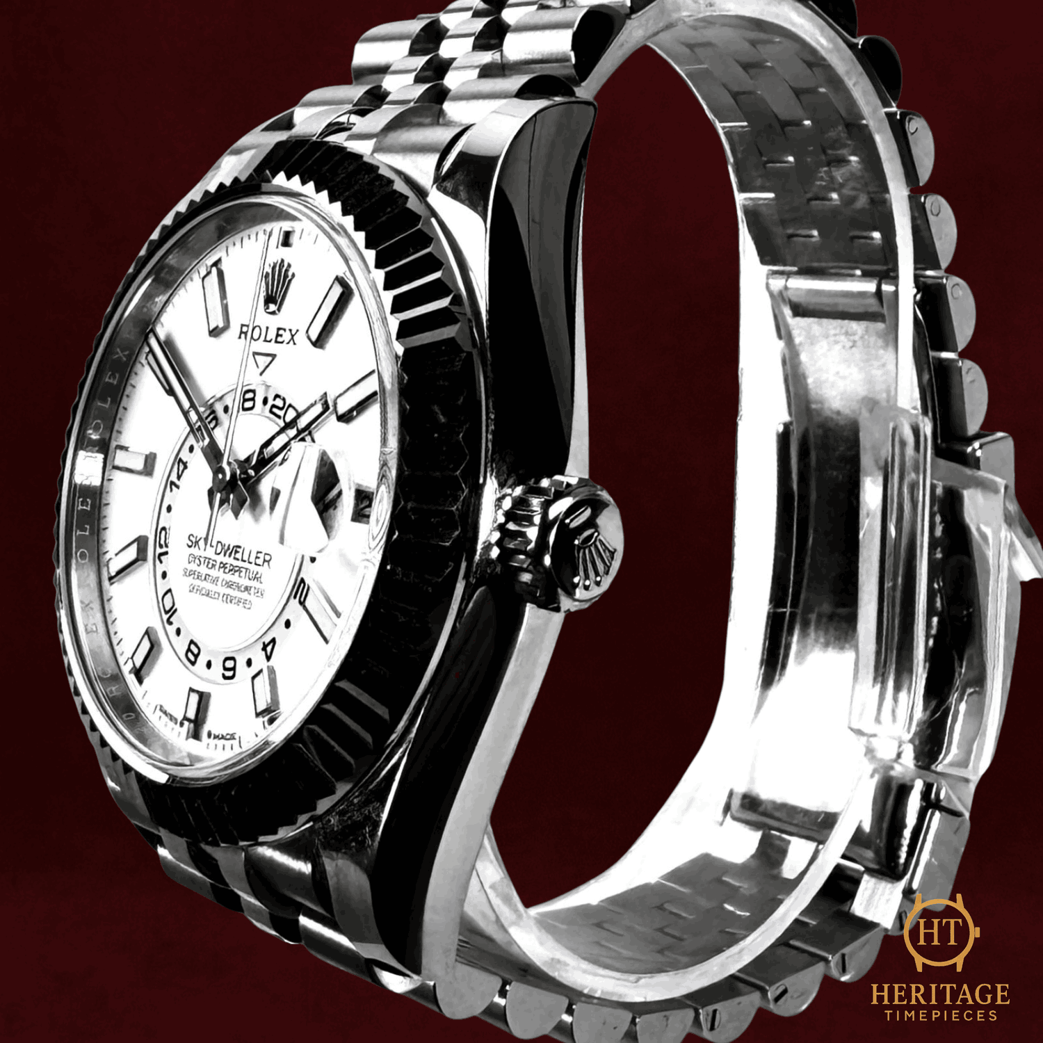 Heritage Narrative The Rolex Sky-Dweller reference 336934 represents Rolex’s most sophisticated travel watch, combining dual time zone functionality with an annual calendar in a robust and highly legible design. Introduced as a solution for frequent travelers, the Sky-Dweller stands apart within the Rolex collection as the brand’s most technically advanced complication. This example from 2025 is presented unworn and offered as a full set. The watch features an intense white dial with Chromalight hour markers and hands, providing excellent legibility and a clean, contemporary aesthetic. The second time zone is displayed via an off-centre 24-hour disc, allowing the wearer to distinguish day and night at a glance, while the Saros annual calendar uses discreet apertures around the dial to indicate the current month. Powering the watch is Rolex’s calibre 9002, a self-winding Perpetual mechanical movement developed specifically for the Sky-Dweller. The movement integrates Rolex’s Ring Command system, which allows the wearer to select and adjust functions via interaction between the fluted bezel, crown, and movement, enabling intuitive and secure setting of time, date, and calendar functions. The 42 mm Oyster case is crafted from stainless steel and paired with a fluted 18kt white gold bezel, a hallmark feature of the Sky-Dweller. The Jubilee bracelet completes the configuration, offering refined comfort and a more elegant profile compared to sport-oriented bracelet options. Presented in factory condition with full accessories, this Sky-Dweller 336934 offers a highly desirable modern configuration combining technical innovation, refined materials, and everyday wearability. Technical Specifications Brand:Rolex Model:Sky-Dweller Reference:336934 Year:2025 Movement:Rolex self-winding Perpetual mechanical movement, Calibre 9002 Complications:Dual time zone (second time zone via 24-hour disc)Annual calendar (Saros system)Month indicationDate Case:42 mm stainless steel Oyster case Bezel:Fluted 18kt white gold bezelRing Command system Crystal:Scratch-resistant sapphire crystal Dial / Hands:Intense white dialChromalight luminous hour markersLuminous hands Bracelet:Stainless steel Jubilee braceletApprox. 8 in (adjustable) Water Resistance:100 m / 330 ft (factory specification) Condition & Inclusions Overall Condition:Unworn Service Status:Factory condition, movement tested and functioning correctly Set:Full set — includes box, certificate, booklets, and tag Shipping & Logistics The watch is stored securely and shipped fully insured within 1–3 business days. Worldwide shipping is available. Any applicable import duties or taxes are the responsibility of the buyer. Shipping & Returns Complimentary insured worldwide shipping and a 14-day return window. Each timepiece is authenticated, time-tested, and professionally prepared prior to dispatch. Secure packaging, tracking, and full insurance are included with every shipment.