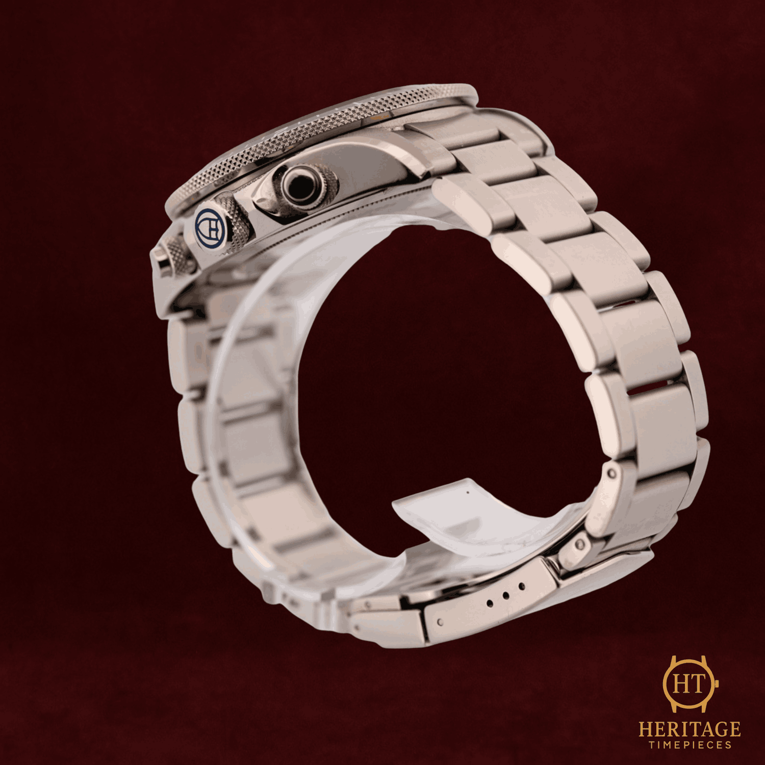Heritage Narrative The Tudor Heritage Chrono reference 70330B draws inspiration from Tudor’s iconic 1970s chronographs, blending vintage racing aesthetics with modern reliability. Its distinctive blue and grey dial with orange accents reflects the bold design language of the Monte Carlo era, reinterpreted for contemporary wear. Technical Specifications Reference:70330B Year:2019 Movement:Automatic chronograph movement Case:42 mm stainless steel case Bezel:Bidirectional rotating bezel in blue Crystal:Scratch-resistant sapphire crystal Dial / Hands:Grey and blue dial with orange chronograph accents and luminous markers Bracelet / Clasp:Stainless steel bracelet with folding clasp Water resistance:150 m (manufacturer specification) Condition & Inclusions Overall grade:Pre-owned — excellent condition Service status:Movement tested and functioning correctly Set:Full set — original box and warranty card Shipping & Logistics Stored off-site and shipped fully insured within 1–3 business days.Worldwide shipping available; buyer responsible for any import duties or taxes. Shipping & Returns Complimentary insured worldwide shipping and a 14-day return window (watch must be returned in the same condition supplied). Each timepiece is authenticated, time-tested, and professionally prepared prior to dispatch. All shipments include secure packaging, tracking, and full insurance coverage.