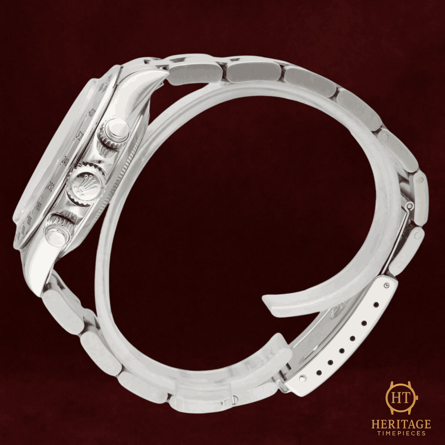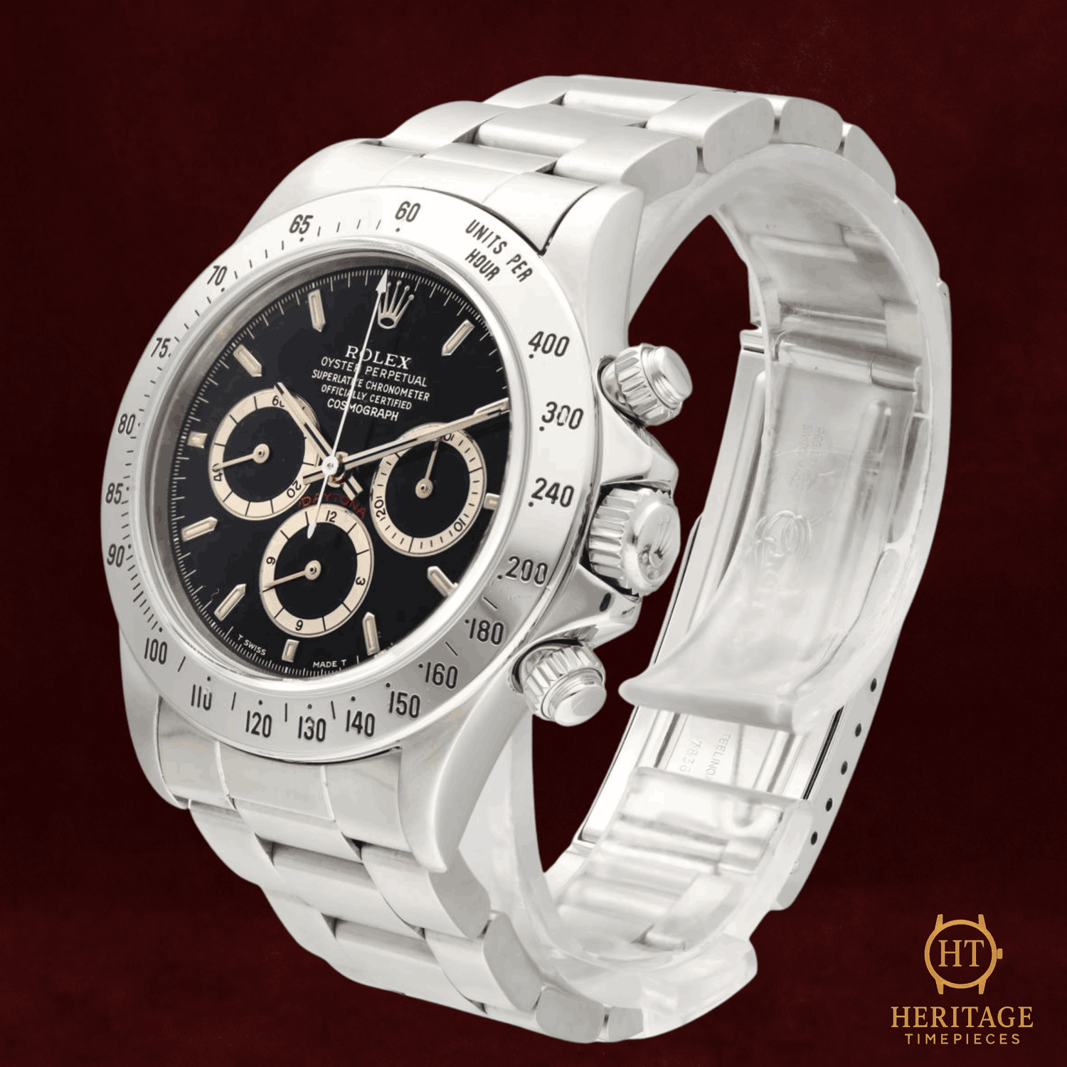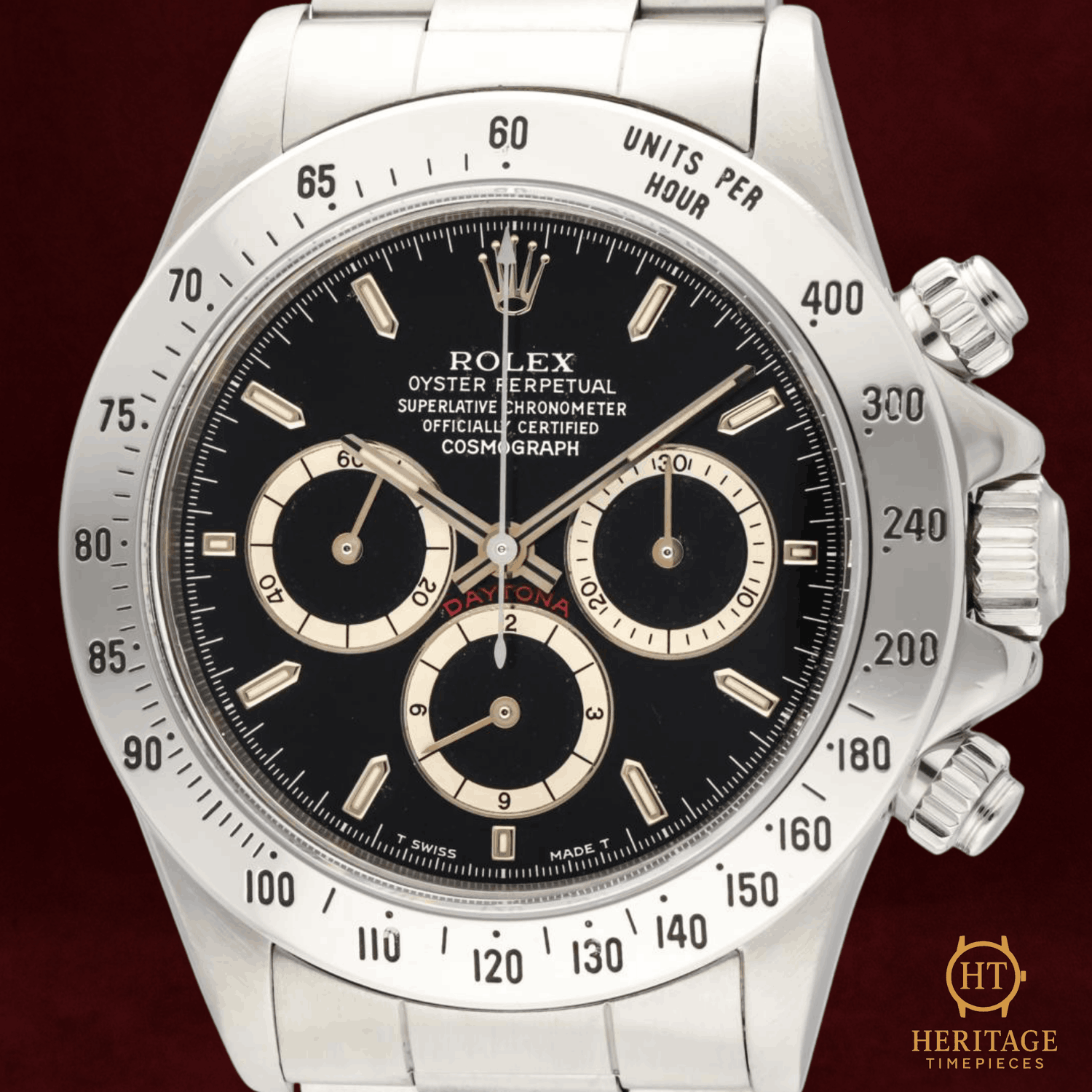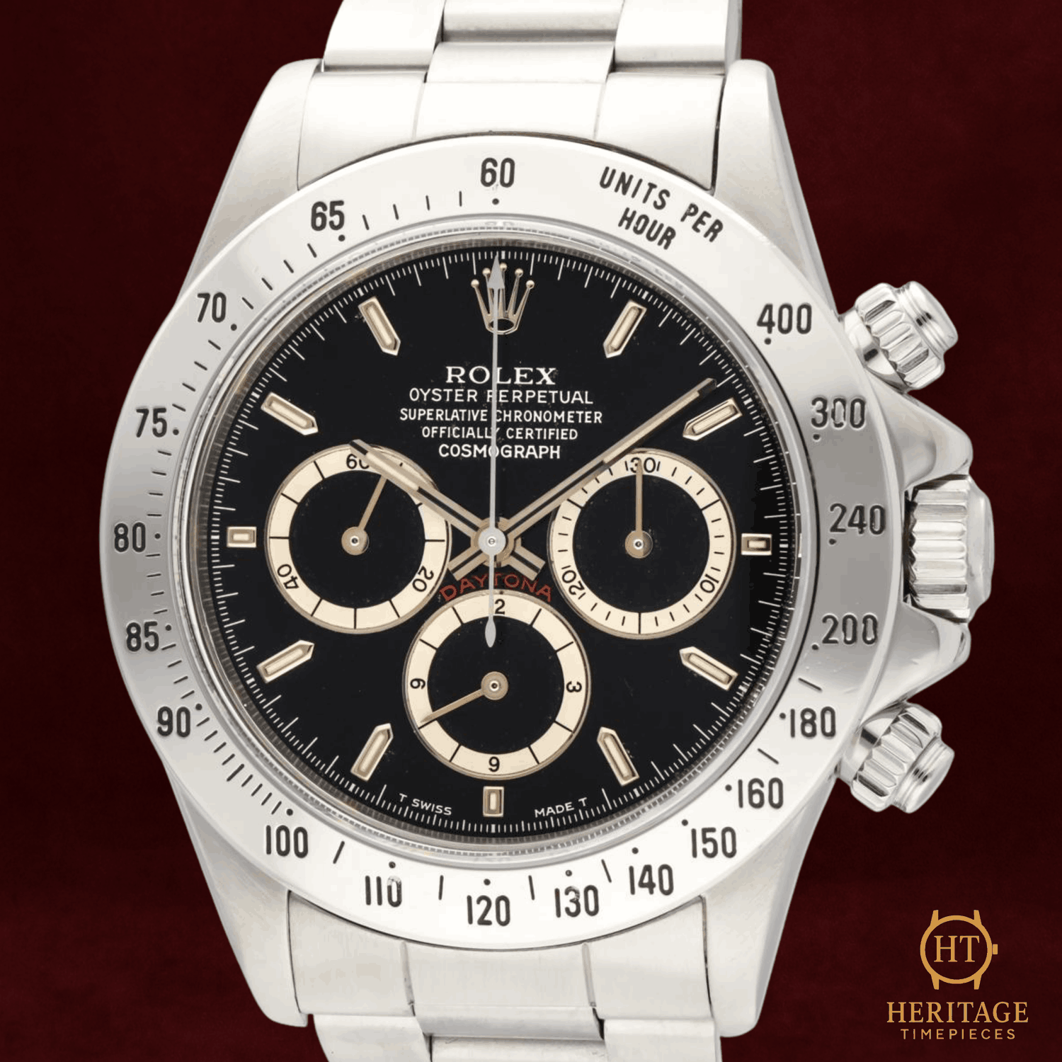 Heritage Narrative The Rolex Cosmograph Daytona reference 16520 marks a pivotal era in Daytona history as the first automatic generation, powered by the Zenith-based calibre. Early examples such as this 1991 production are especially sought after, featuring the rare “inverted 6” dial — a subtle detail that has become highly collectible among enthusiasts. Technical Specifications Reference:16520 Year:1991 Movement:Rolex automatic chronograph movement (Zenith-based calibre 4030) Case:40 mm Oyster case in stainless steel Bezel:Fixed stainless steel bezel with engraved tachymeter scale Crystal:Scratch-resistant sapphire crystal Dial / Hands:Black dial with chronograph subdials and “inverted 6” detail Bracelet / Clasp:Stainless steel bracelet with folding clasp Water resistance:100 m (manufacturer specification) Condition & Inclusions Overall grade:Pre-owned — good condition Service status:Running within specification Set:Watch only (no box or papers) Shipping & Logistics Stored off-site and shipped fully insured within 1–3 business days.Worldwide shipping available; buyer responsible for any import duties or taxes. Shipping & Returns Complimentary insured worldwide shipping and a 14-day return window (watch must be returned in the same condition supplied). Each timepiece is authenticated, time-tested, and professionally prepared prior to dispatch. All shipments include secure packaging, tracking, and full insurance coverage.