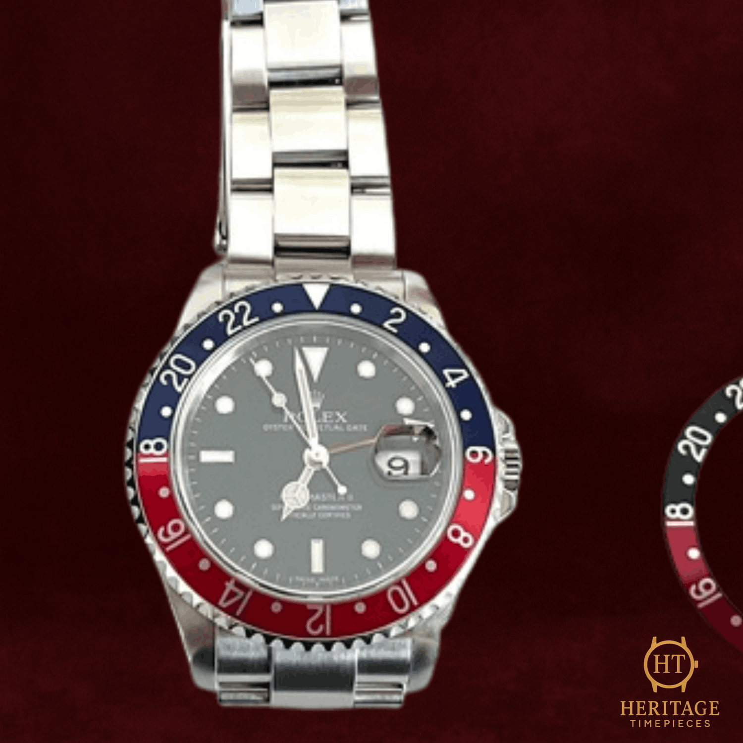 Heritage Narrative The Rolex GMT-Master II reference 16710 represents the final generation of the classic aluminum bezel GMT models. Equipped with the upgraded calibre 3186, it marks a transitional period in Rolex’s GMT lineage, combining traditional design with improved movement technology. Technical Specifications Reference:16710 Year:August 2007 (Z-serial) Movement:Rolex calibre 3186 automatic self-winding movement Case:40 mm Oyster case in stainless steel Bezel:Bidirectional rotating bezel with interchangeable aluminum inserts Crystal:Scratch-resistant sapphire crystal Dial / Hands:Black dial with luminous hour markers and GMT hand Bracelet / Clasp:Rolex Oyster bracelet in stainless steel with folding clasp Water resistance:100 m / 330 ft (manufacturer specification) Condition & Inclusions Overall grade:Pre-owned — excellent condition Service status:Movement tested and functioning correctly Set:Full set — includes original box and papersIncludes additional black and “Coke” bezel inserts Shipping & Logistics Stored off-site and shipped fully insured within 1–3 business days.Worldwide shipping available; buyer responsible for any import duties or taxes. Shipping & Returns Complimentary insured worldwide shipping and a 14-day return window (watch must be returned in the same condition supplied). Each timepiece is authenticated, time-tested, and professionally prepared prior to dispatch. All shipments include secure packaging, tracking, and full insurance coverage.