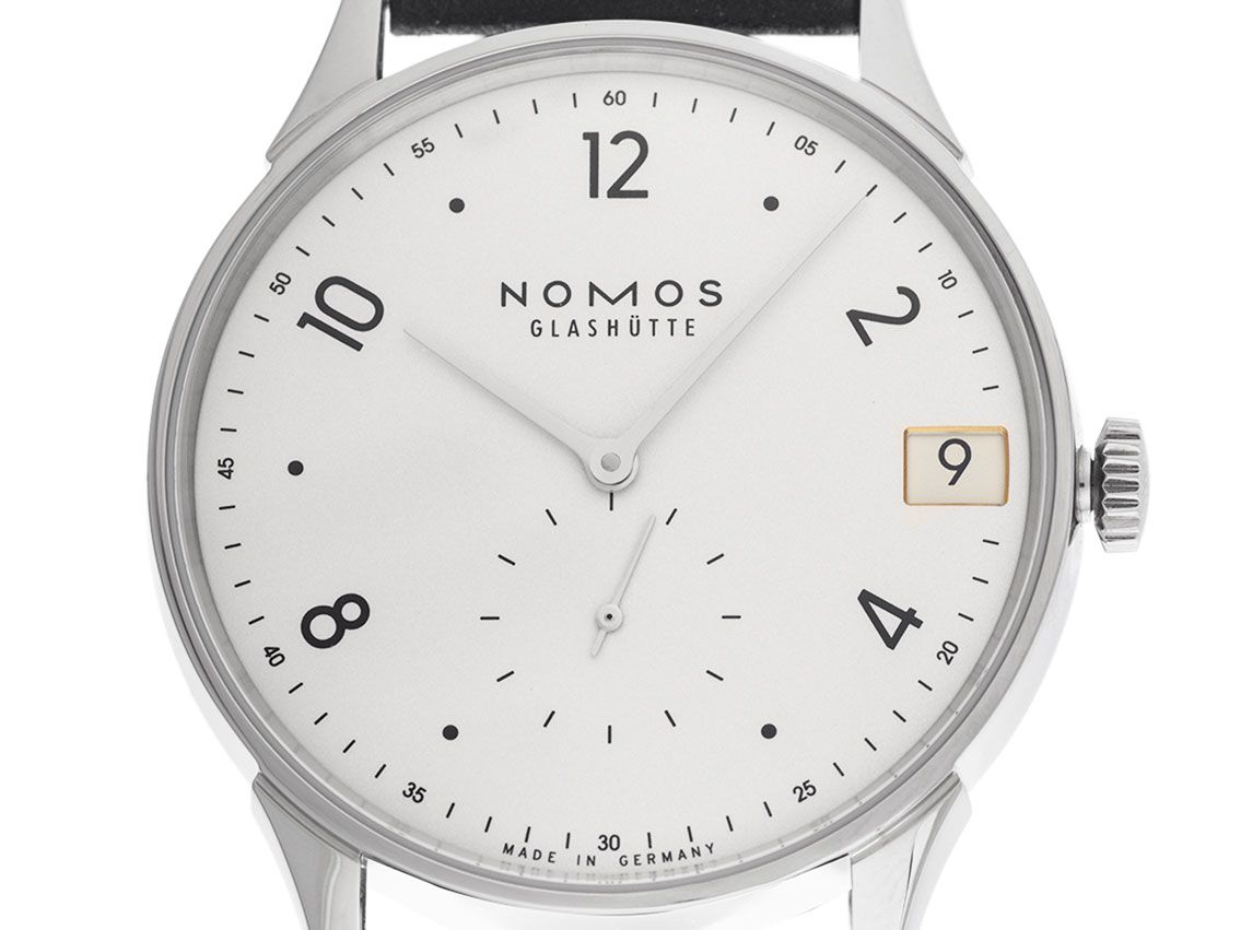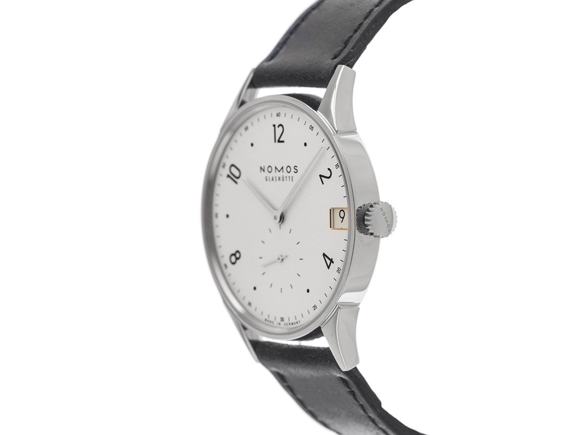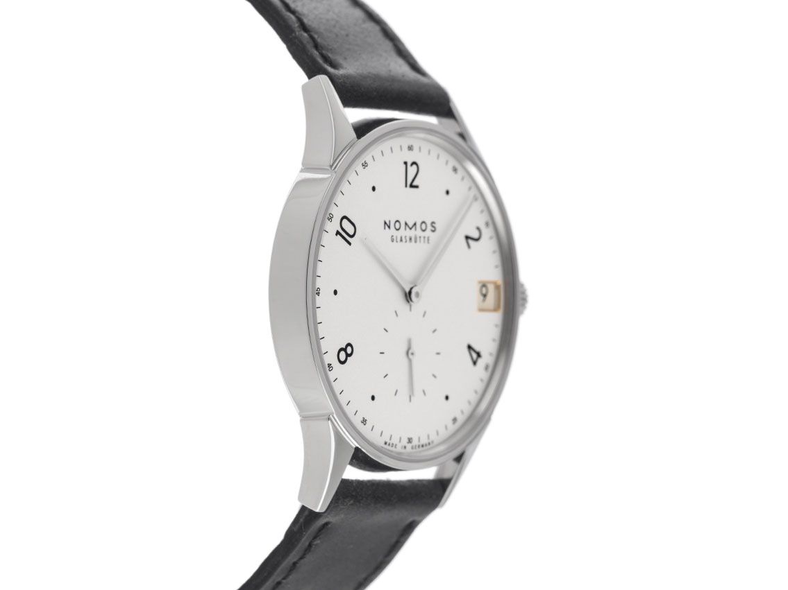 Gehäuse Edelstahl poliert, dreiteilig, Gehäusedurchmesser ohne Krone 35,5mm, Gehäusehöhe 7,5mm. Armband Leder, pflanzlich gegerbt, handgenäht, Anstoßbreite 19mm, Stiftschließe Edelstahl mit Hersteller-Logo. Zifferblatt silberfarben galvanisiert mit schwarzen arabischen Ziffern und schwarzen Punkt Indexen, schwarzer Minuterie sowie rhodinierten Edelstahl Zeigern. Uhrwerk Handaufzug, Nomos Manufakturkaliber DUW4601 mit 23 Edelsteinen, Gangreserve ca. 52 Stunden. Anzeige von Stunde und Minute über Zeiger aus der Mitte, kleine Sekunde mit Sekundenstopp zur sekundengenauen Einstellung der Uhrzeit bei 6 Uhr. Saphirglas kratzfest. Krone geriffelt mit Hersteller-Logo. Boden Edelstahl graviert mit Saphirglas Sichtfenster. Gewicht der Uhr inklusive Armband 49g. Wasserdicht bis 3 ATM. Referenznummer: 1250, ID: ST116037000426H-2860, Artikelnummer: 10000085543. Original Nomos Glashütte Box mit Umkarton und Garantie Papiere von April 2026, Full Set. Neu. Lieferzeit sofort.