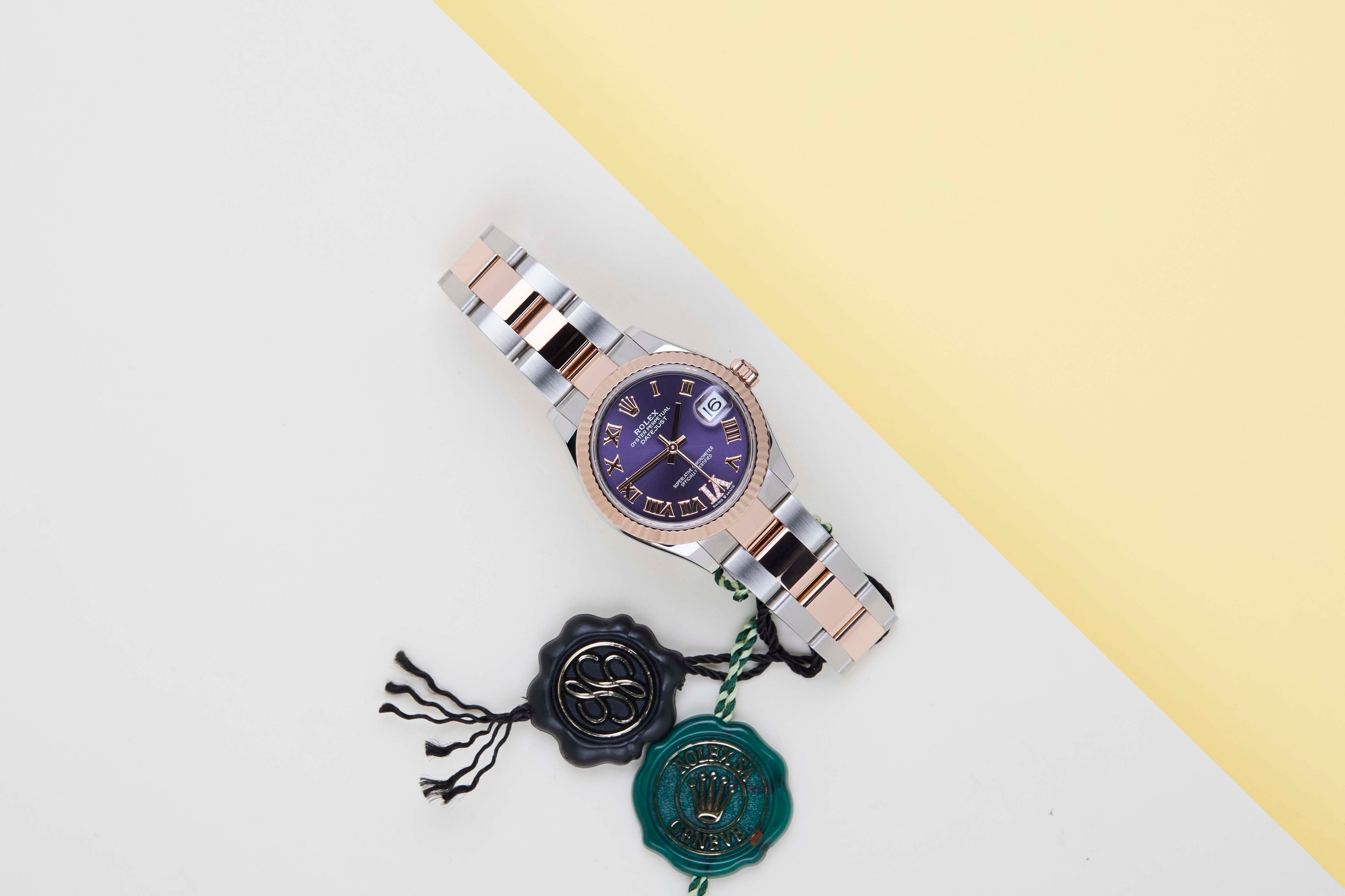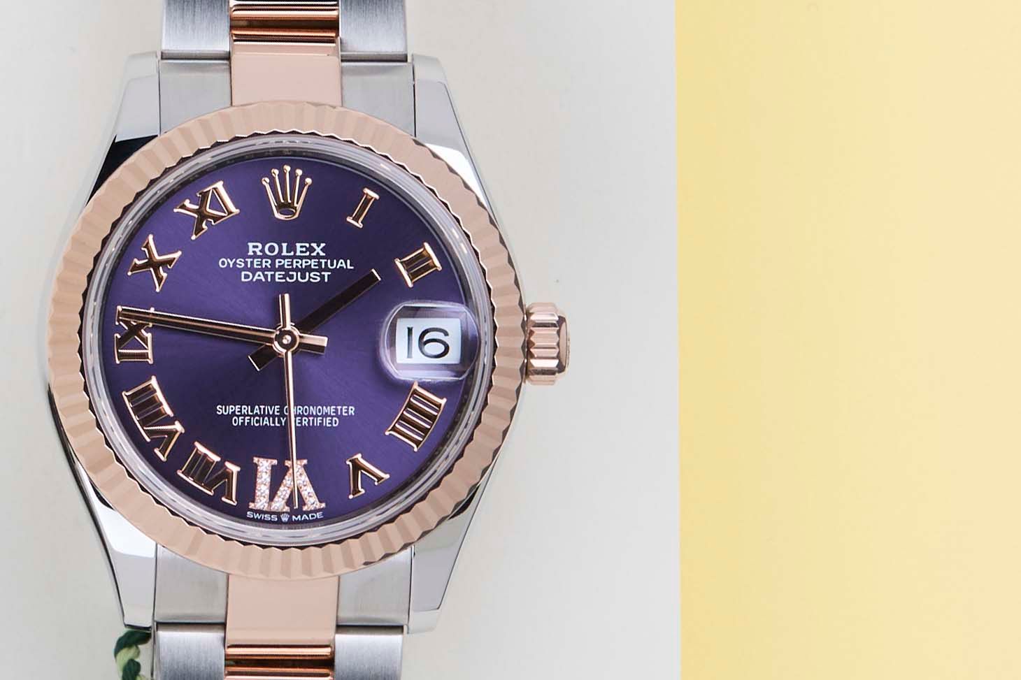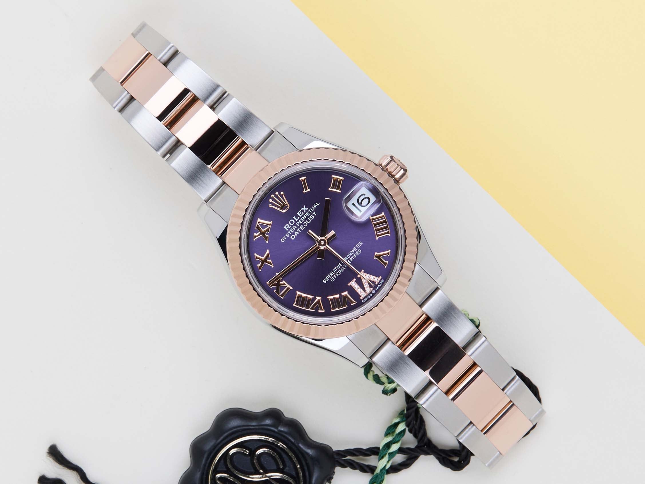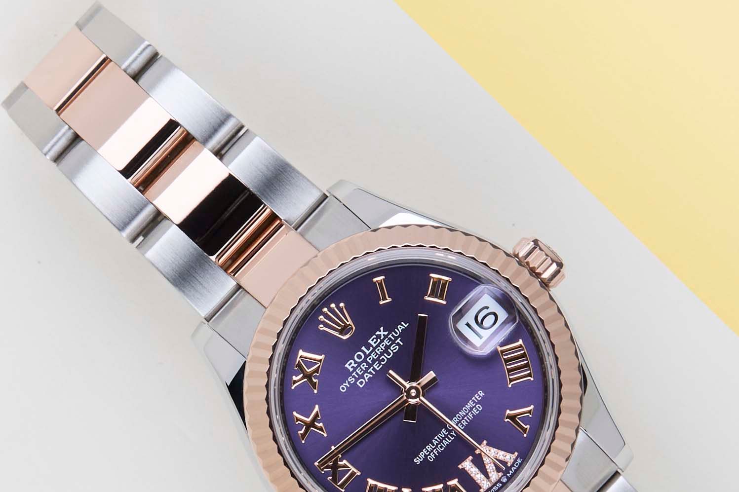 Rolex introduced the original Datejust in 1945 to celebrate the company's 40th anniversary. This Rolex Datejust 31 'Aubergine Diamond VI - Oyster' has been sold for the first time in September 2021.This Datejust is made of a combination of 18k Rose Gold and stainless steel and is fitted with an Oyster bracelet.This Rolex Datejust 31 is in Mint condition and comes with the original Rolex Warranty Card and box. Furthermore, the watch has been serviced by our watchmakers and therefore has One year of Steiner Warranty.