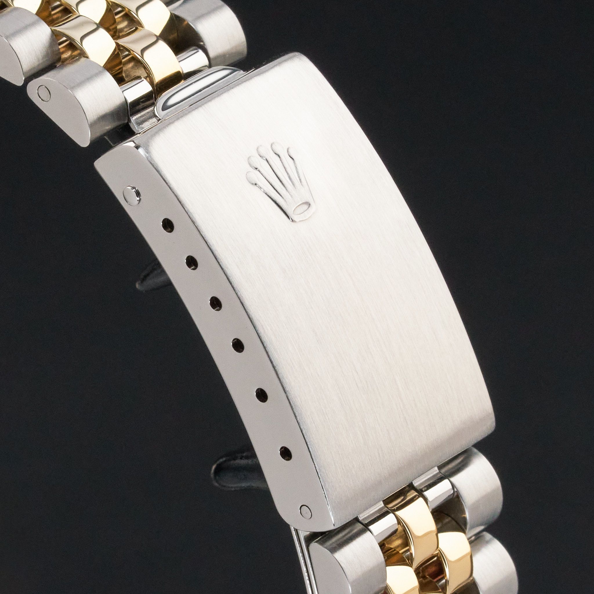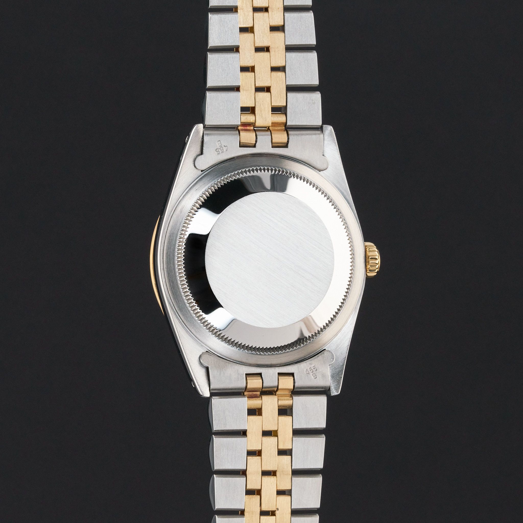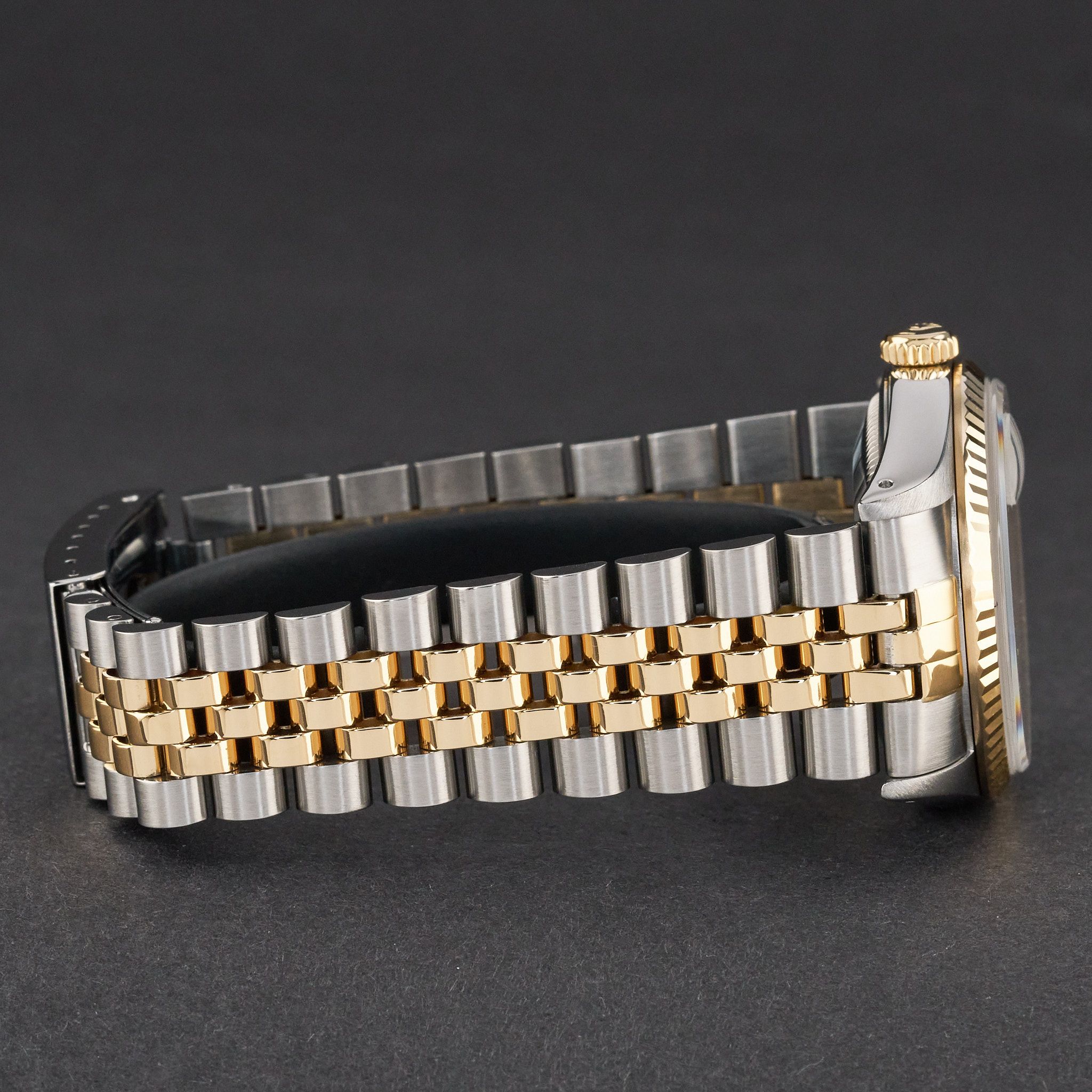 This Rolex Datejust 16233 features a Silver dial and is crafted from 18K yellow gold and stainless steel, with a production year of 1991.