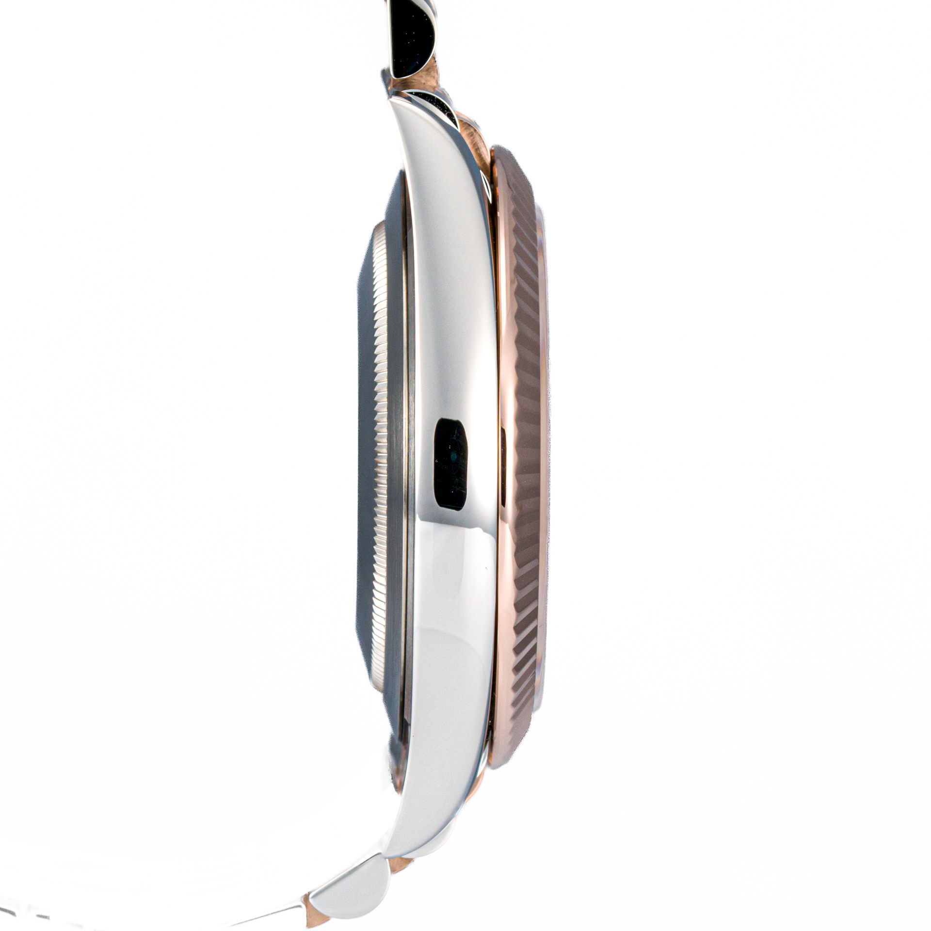 The case and bezel represent a classic combination of brushed 904L steel and polished facets, complemented by 18-carat Everose gold. The fluted bezel is crafted from this very gold and imparts the model's characteristic aristocratic aura.