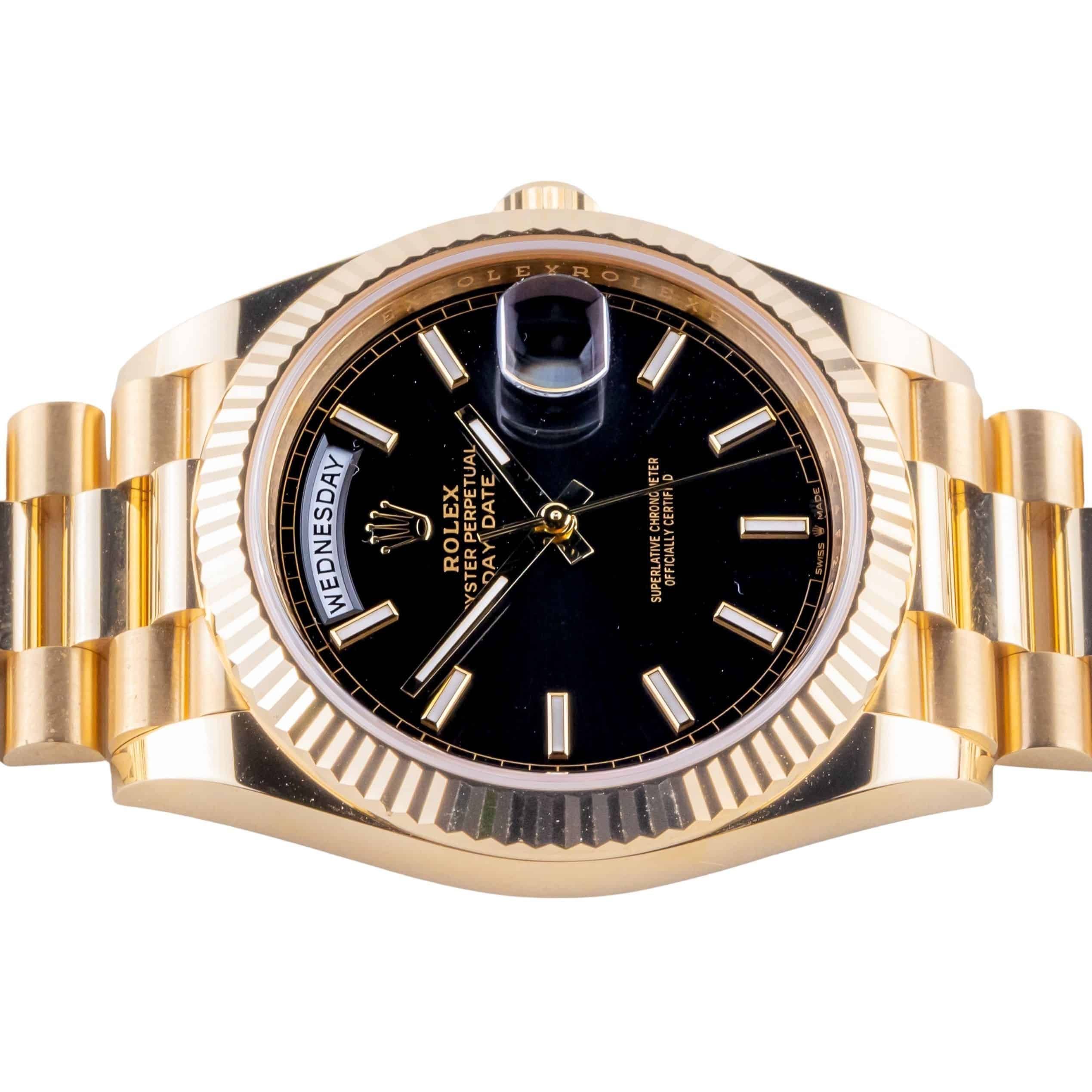 Rolex Oyster Perpetual Day-Date Reference 228238 from 2026 including full set. The Day-Date 228238 measures a 40mm 18k gold case, a 18k gold president bracelet with Crownclasp and fluted 18k gold bezel. The Day-Date 228238 features an automatic movement caliber 3255 with a double quickset date and day function, a scratch resistance sapphire crystal and a Black dial.