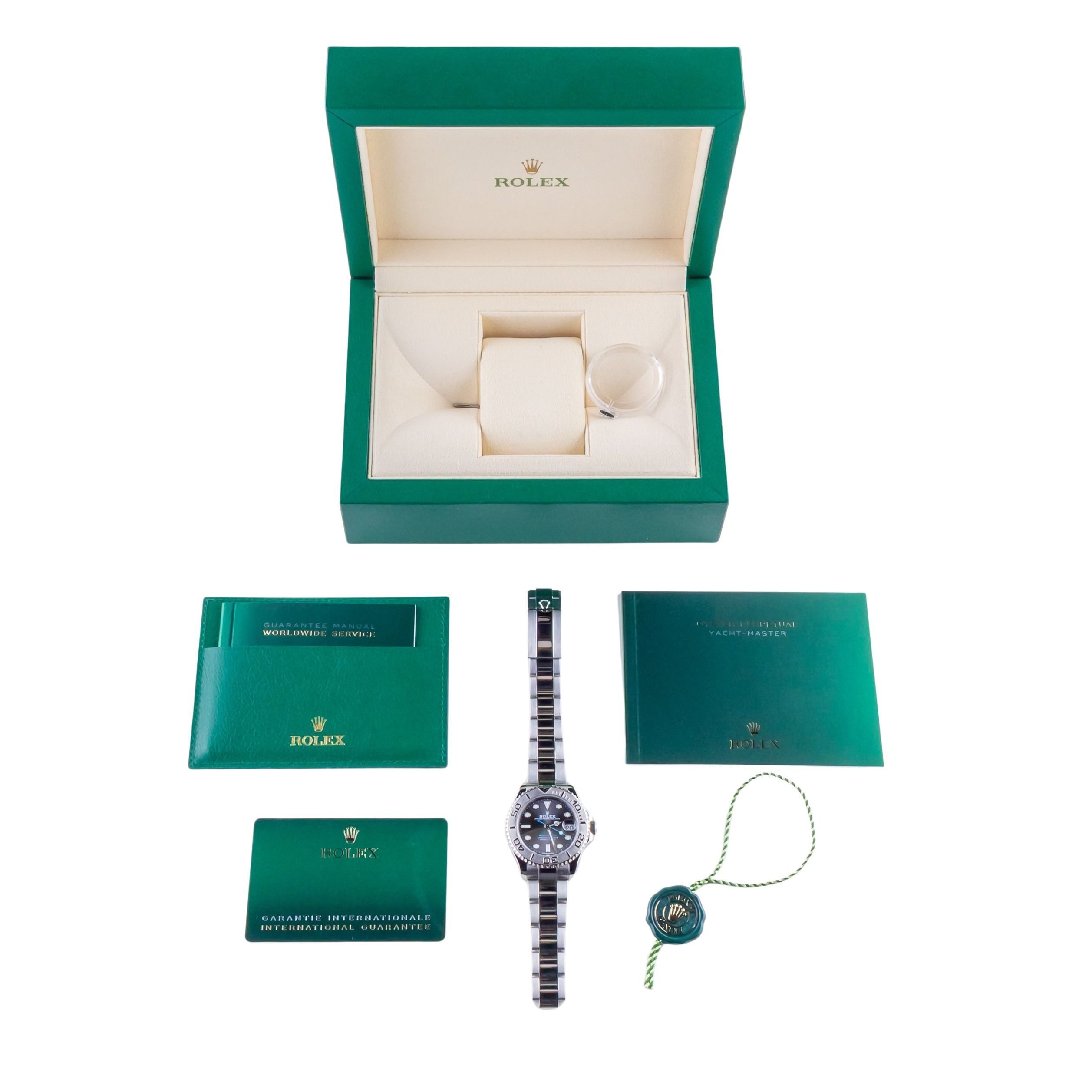 Rolex Oyster Perpetual Yacht-Master Reference 268622 from 2022 including full set. The Yacht-Master 268622 measures a 37mm stainless steel case, a stainless steel Oyster bracelet w/ Oysterlock clasp and a platinum bidirectional bezel. The Yacht-Master 268622 features an automatic movement caliber 2236 with quickset date function, a scratch resistance sapphire crystal and Rhodium colored dial with Chromalight display.