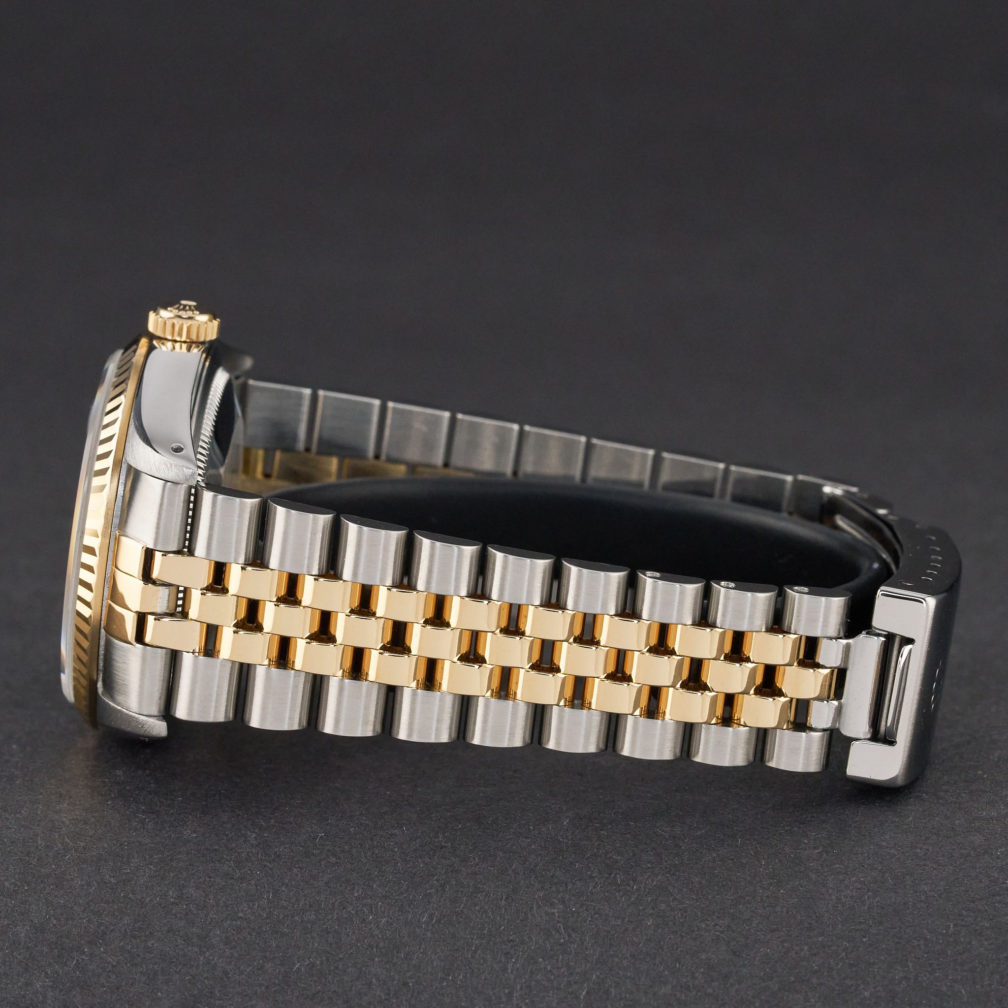 This Rolex Datejust 16233 features a Blue small diamond dial and is crafted from 18K yellow gold and stainless steel, with a production year of 1990.