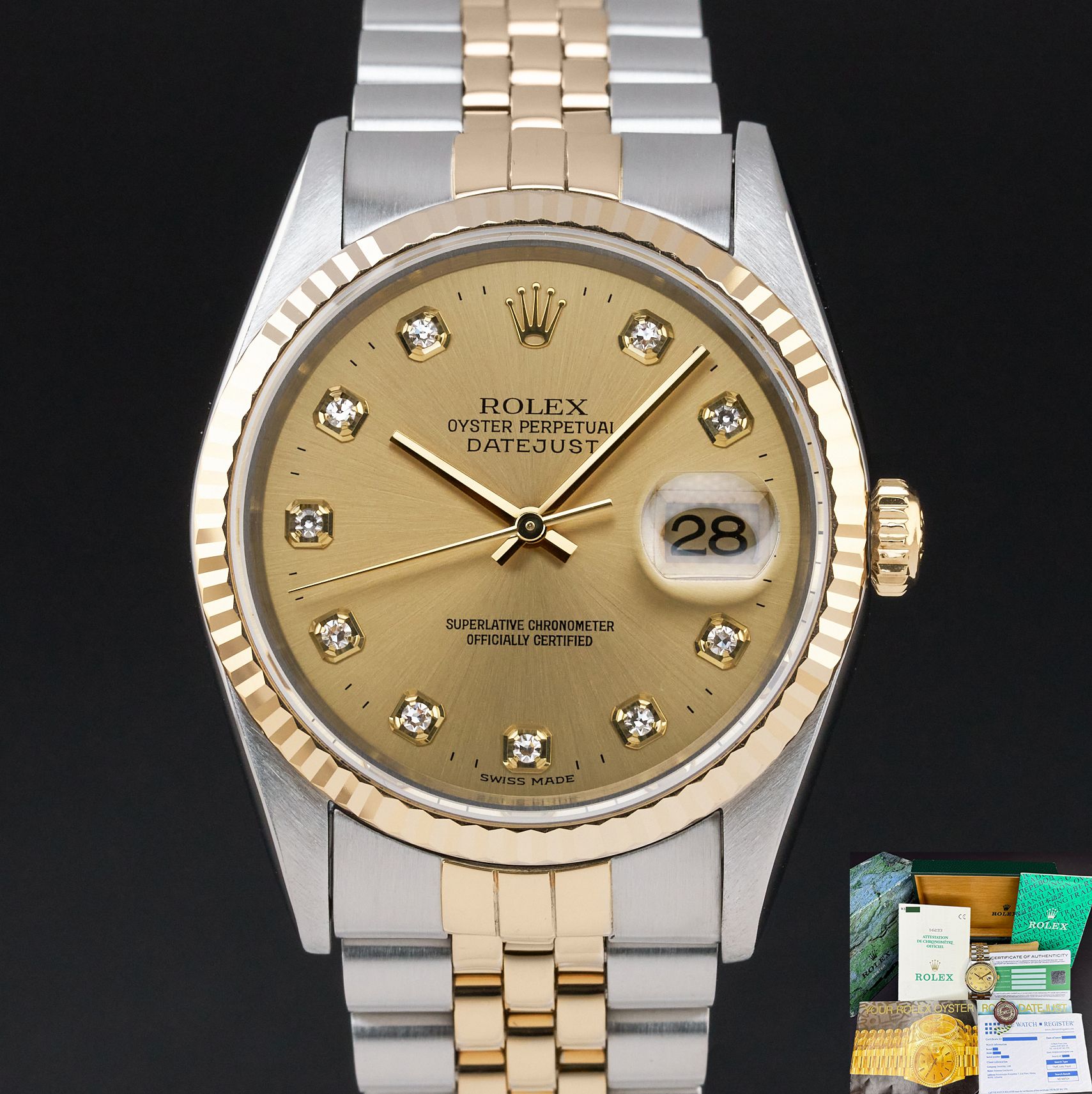 Rolex Datejust, 16233, 36mm, 1995, Two-Tone, Champagne Big Diamond dial, Fullset, 1y warranty