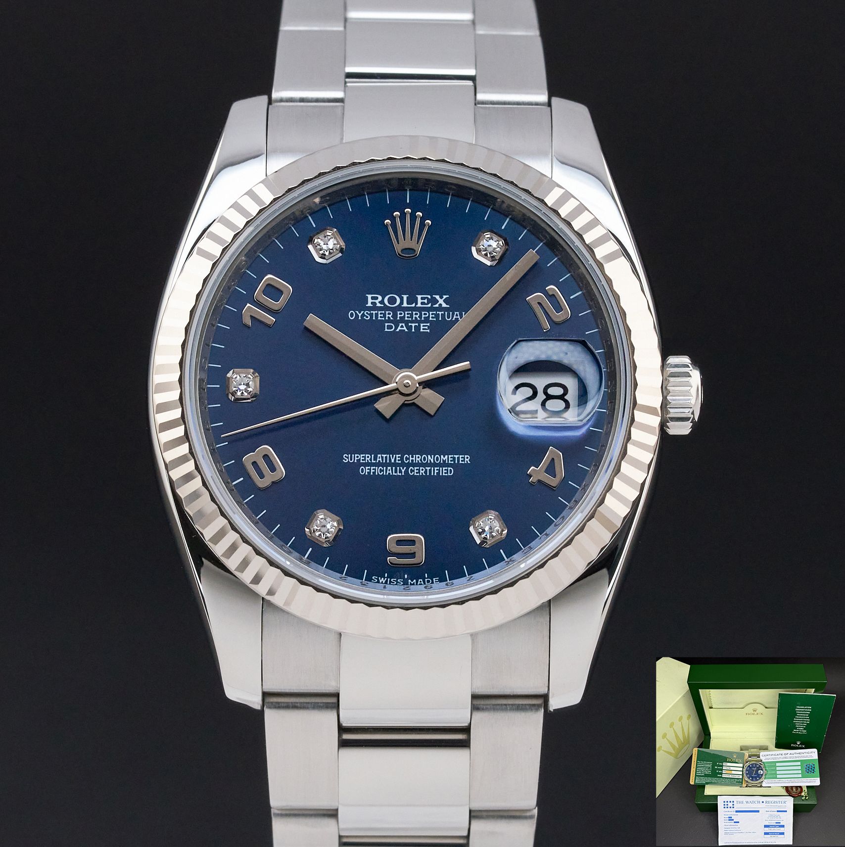 This Rolex Oyster Perpetual Date 115234 features a Blue Arabic diamond dial and is crafted from stainless steel, with a production year of 2007.