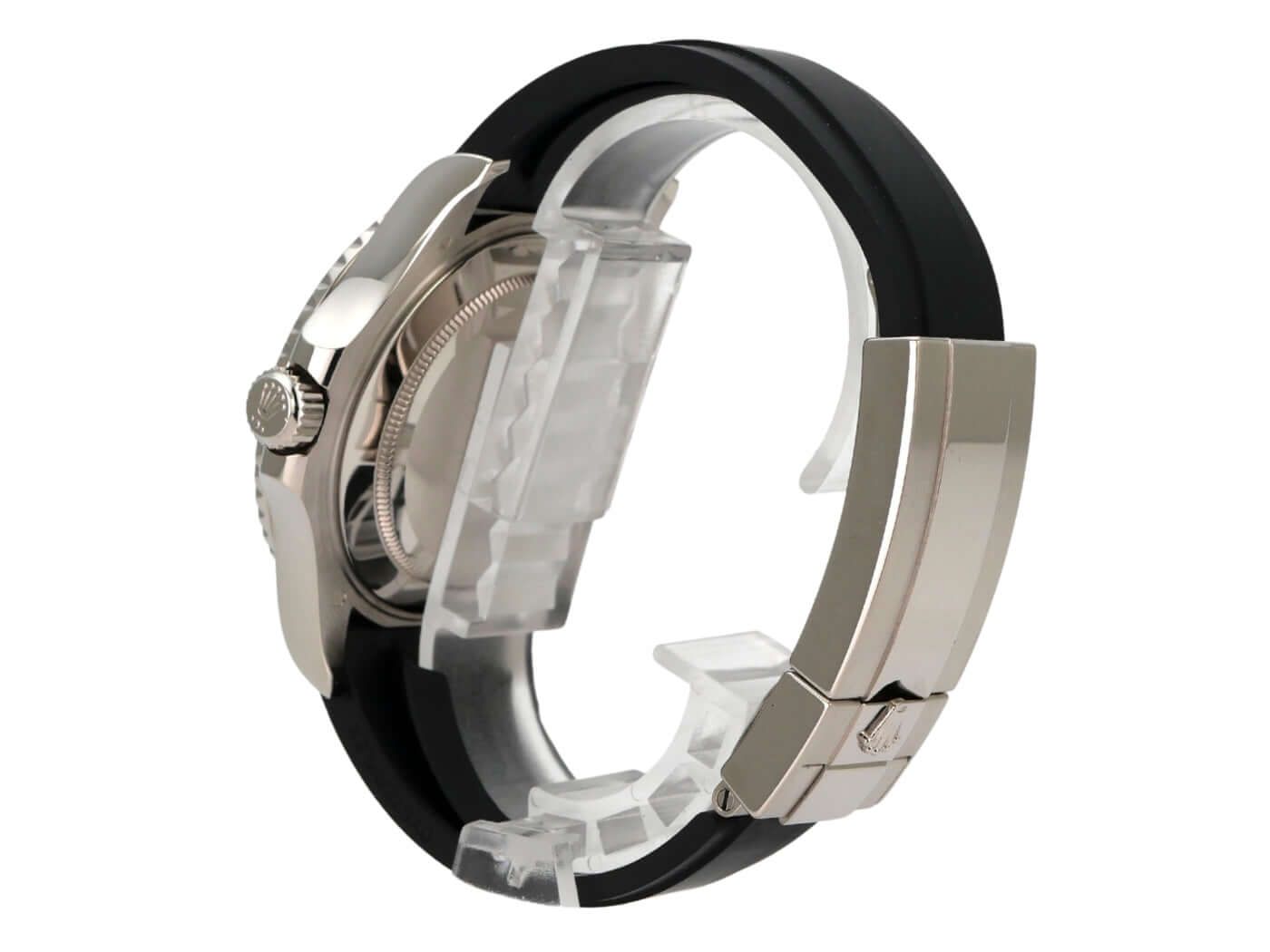 Case made of 18 kt polished and satin-finished white gold, case diameter 42 mm, bezel made of 18 kt white gold with ceramic insert, bidirectional rotatable, Oyster rubber strap with safety folding clasp, black dial with applied luminous indices, luminous dots, luminous hands, automatic movement, Rolex manufacture caliber 3235 with 31 jewels, frequency 28,800 A/h, 70-hour power reserve, date display, chronometer, scratch-resistant sapphire crystal, screw-down crown with crown guards, 18 kt white gold screw-down case back, water-resistant up to 10 bar.