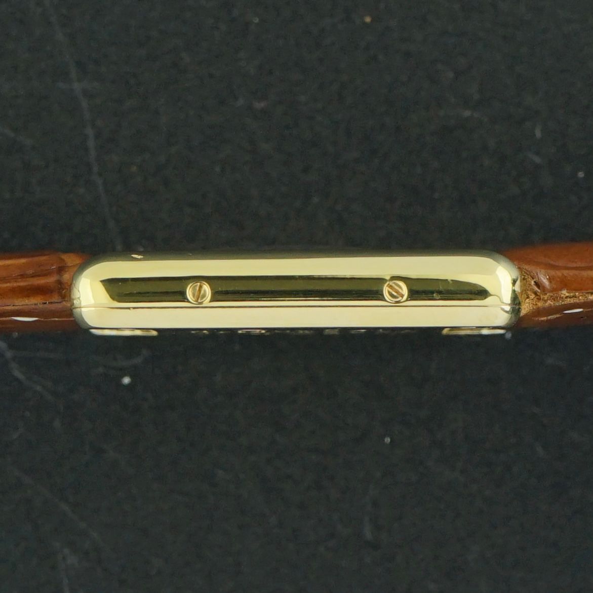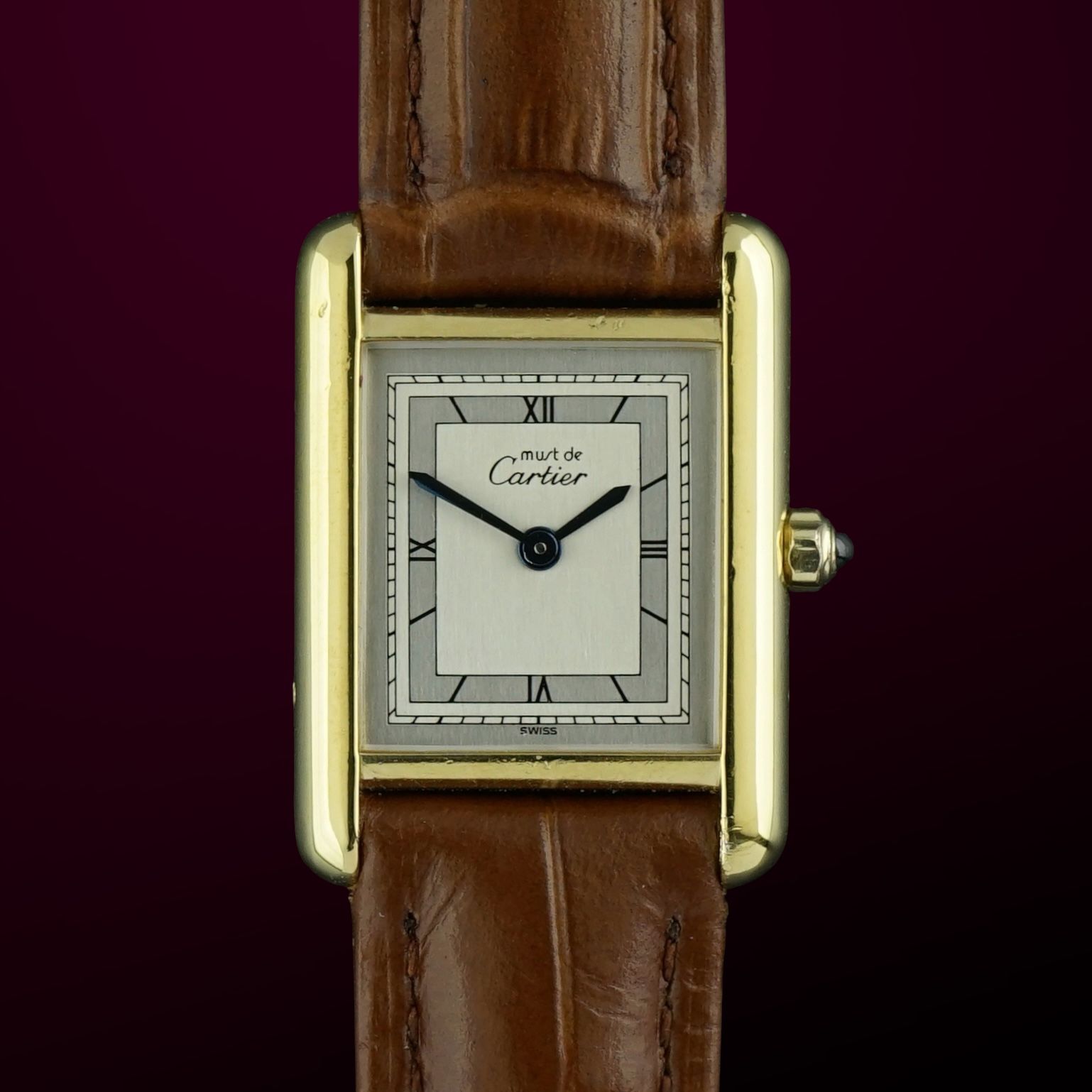 A Vintage Cartier Tank Vermeil Must from the 1990s featuring a silver case with gold plating, exceptionally well preserved with no signs of wear or silver showing through. The silver dial has a vertically brushed finish in a classic sector layout, with a minute track and inner Roman numeral hour markers. Powered by a quartz movement that has been overhauled in April 2026 and now runs and functions excellently. Paired with a brown leather strap with crocodile motif that complements the watch beautifully. Overall condition is exceptional, making this a stunning vintage ladies dress watch. Year of production: 1990s Serial number: 07801 Model / Reference number: 366001 Case dimensions. - Width excluding crown: 20,5mm - Width including crown: 23,5mm - Lug to lug: 28mm - Thickness: 5,4mm Lugs width: 15mm Strap: A brown leather strap with a crocodile motif. (Fits a 10 to 18cm wrist) Total head-only weight: 12,4g Country of origin: Switzerland Movement: Cartier Quartz Service information: Movement overhauled in April 2026. Runs and functions excellently. Internal code: M 1536