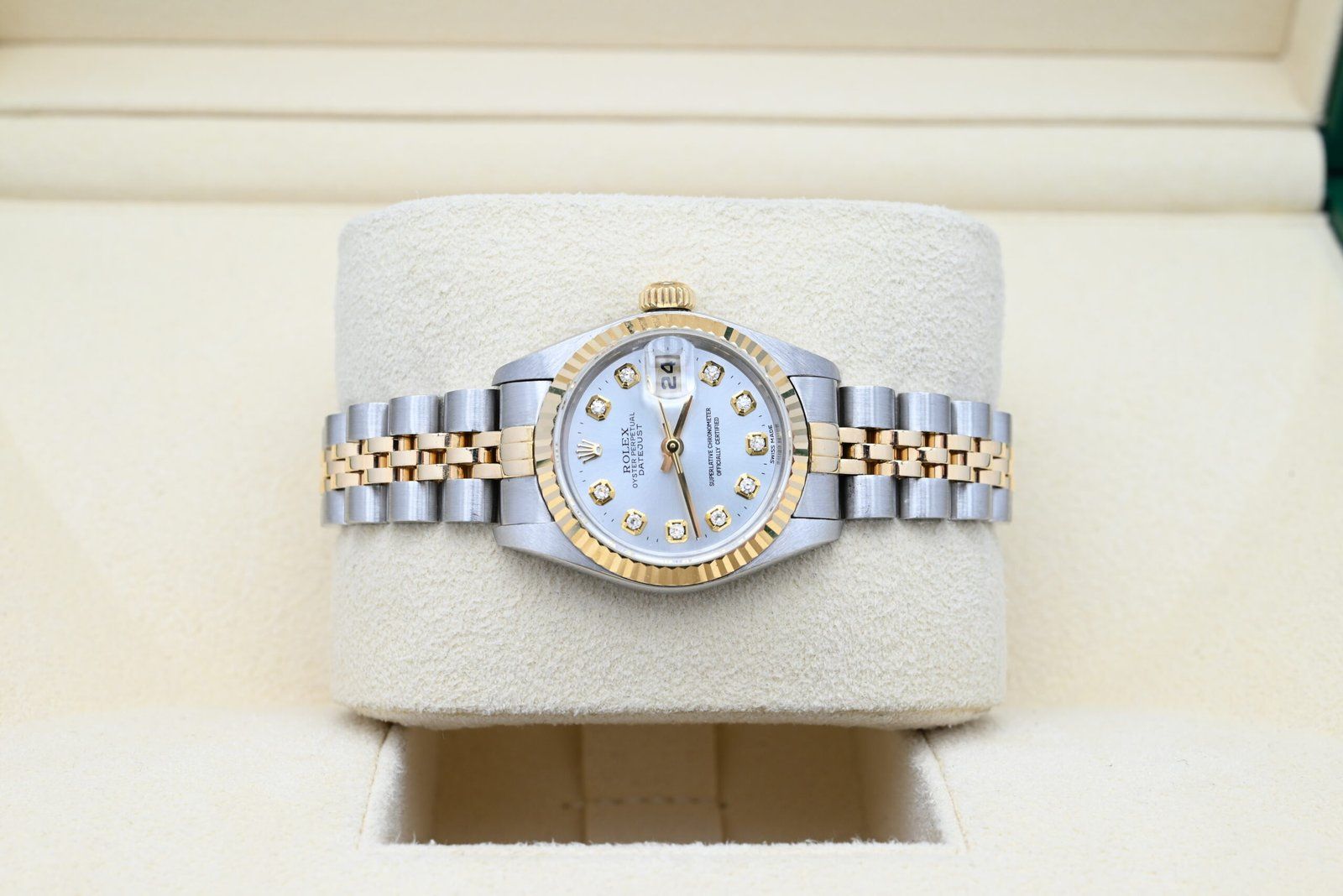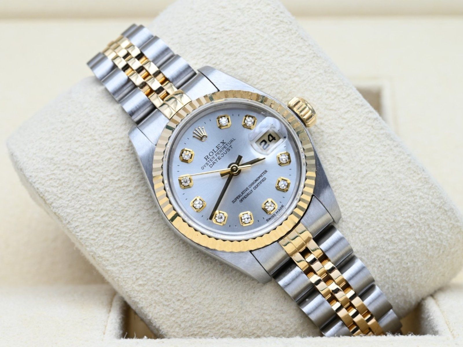 Rolex Lady-Datejust 69173 with the silver diamond dial from 1995 in excellent condition, including the original box and papers.