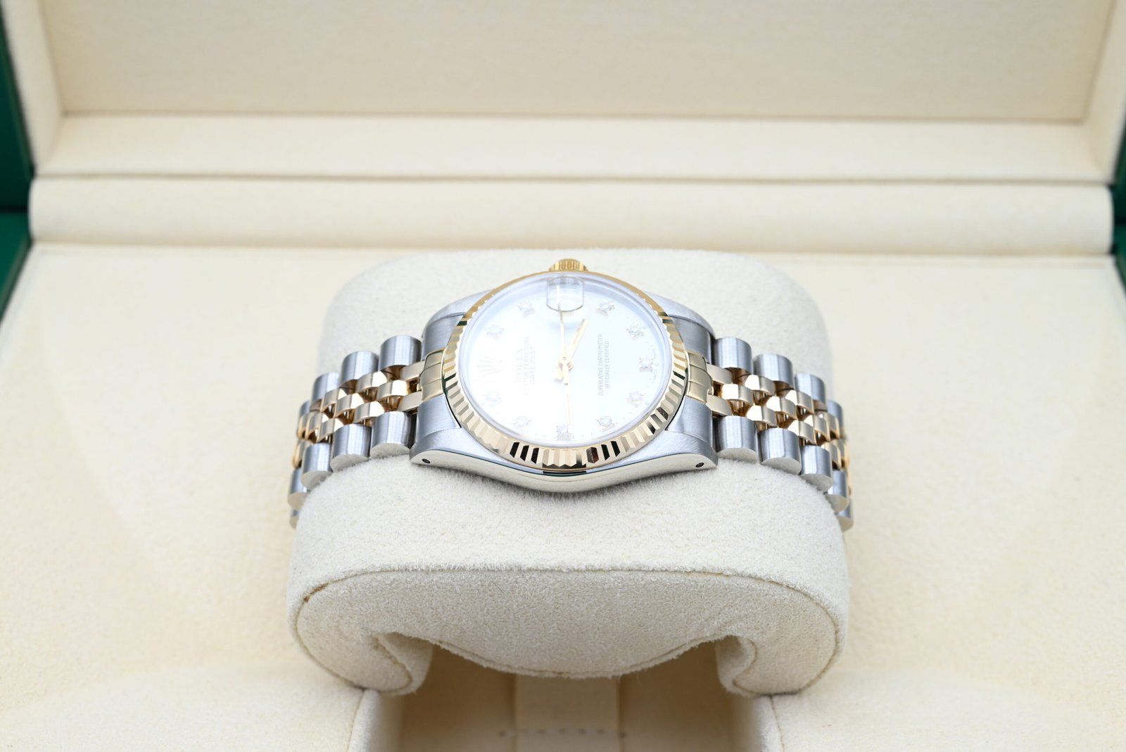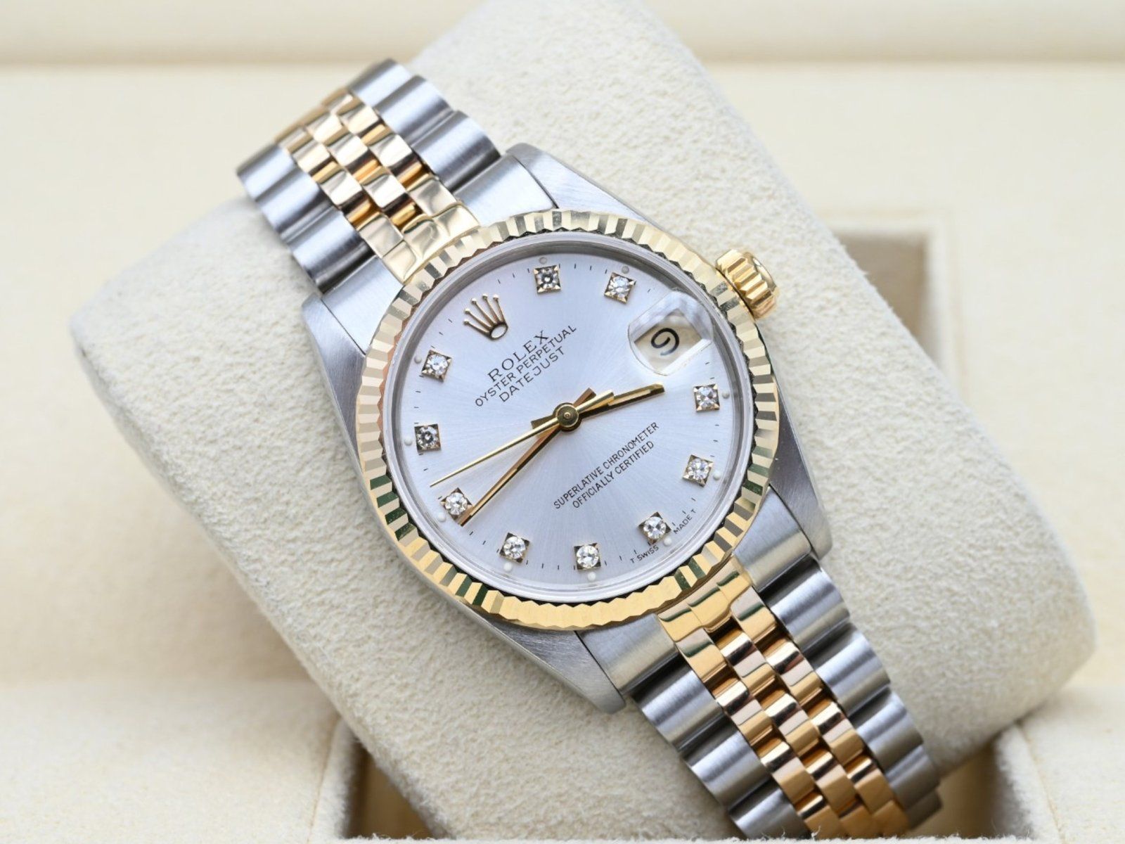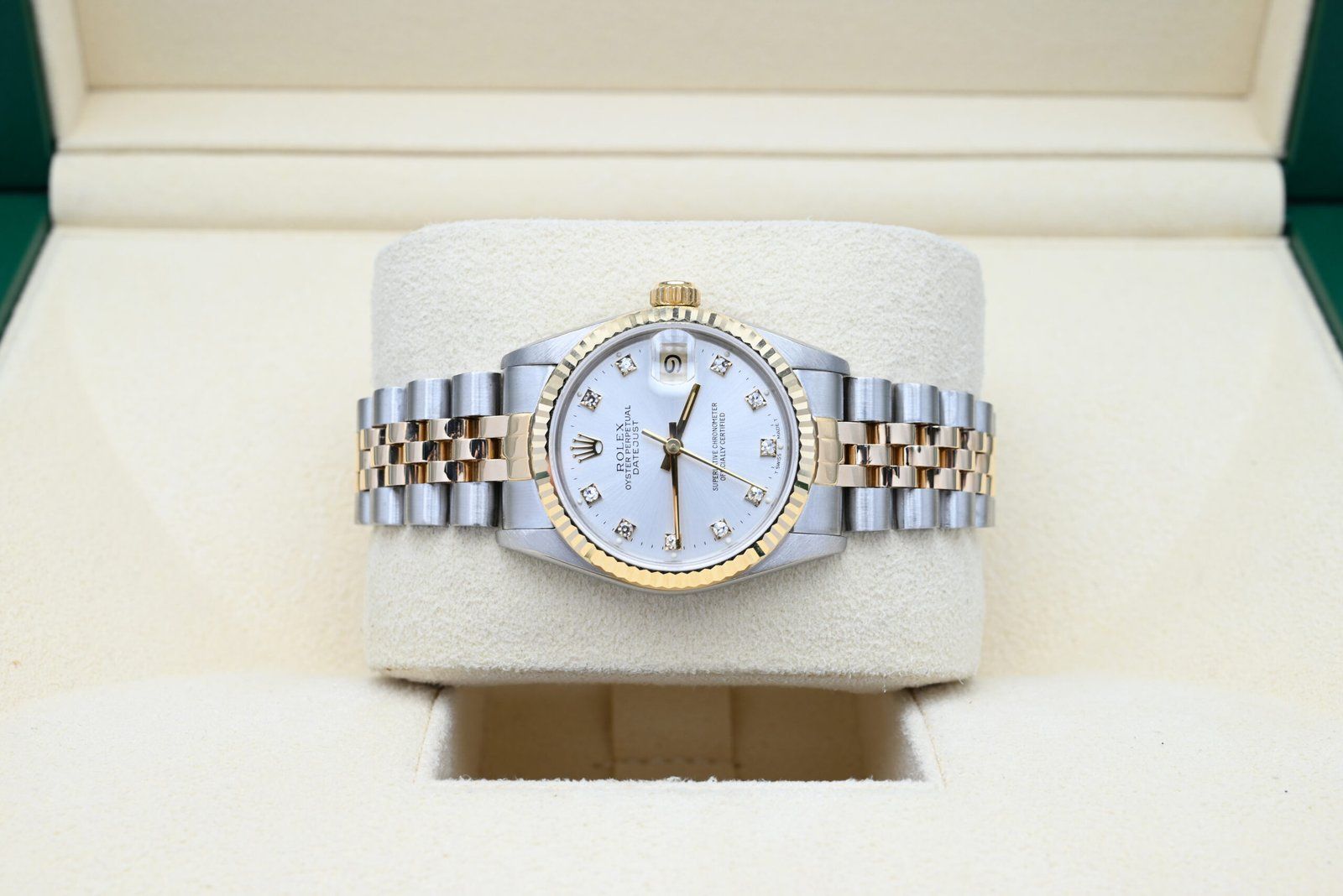 Rolex Datejust 68273 from 1992 with the silver diamond dial in excellent condition, including the original box and papers.