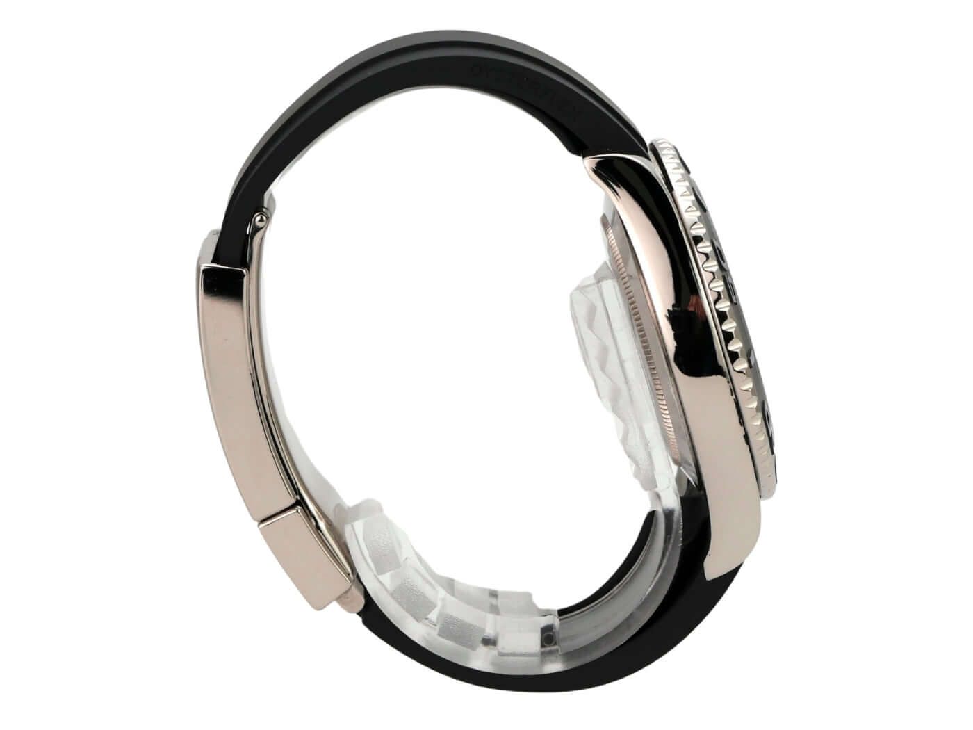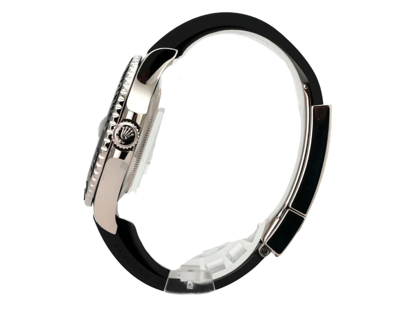 Case made of 18 kt polished and satin-finished white gold, case diameter 42 mm, bezel made of 18 kt white gold with ceramic insert, bidirectional rotatable, Oyster rubber strap with safety folding clasp, black dial with applied luminous indices, luminous dots, luminous hands, automatic movement, Rolex manufacture caliber 3235 with 31 jewels, frequency 28,800 A/h, 70-hour power reserve, date display, chronometer, scratch-resistant sapphire crystal, screw-down crown with crown guards, 18 kt white gold screw-down case back, water-resistant up to 10 bar.