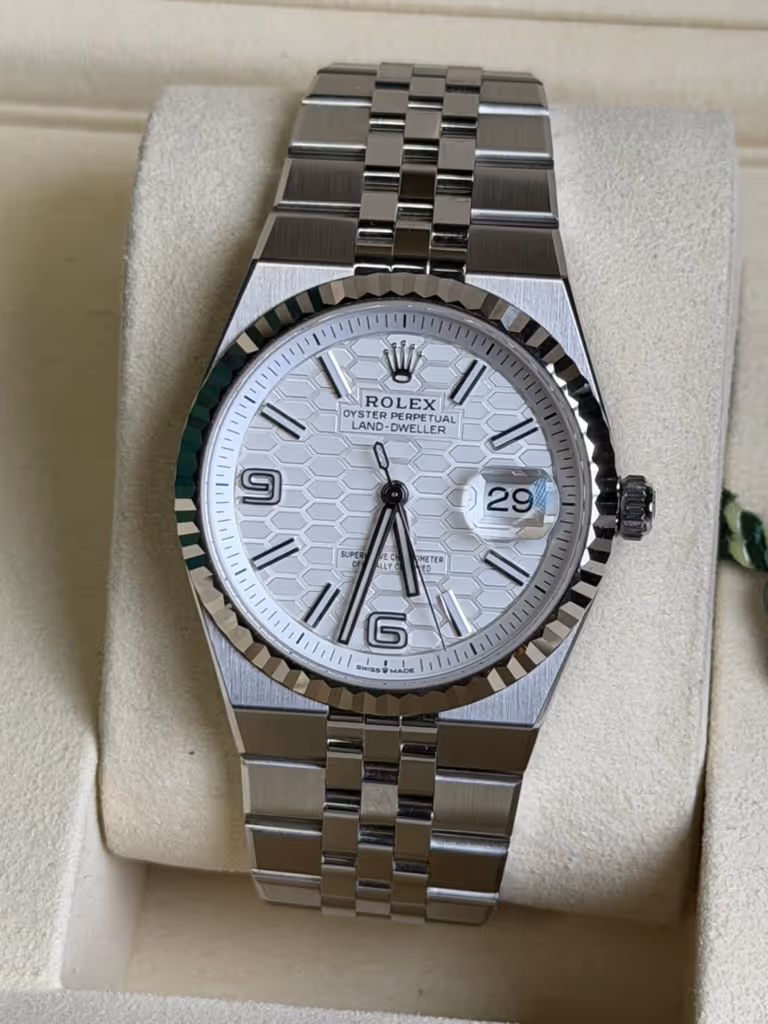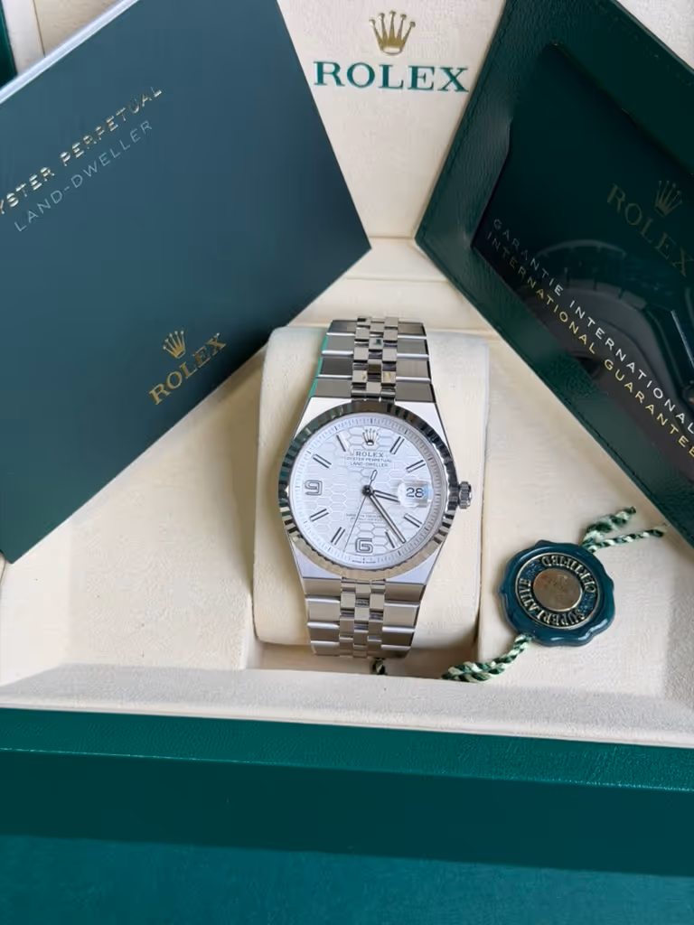 The Land-Dweller, launched in 2025 as a new pillar alongside the Sea-Dweller and the Sky-Dweller, offers collectors a distinctly modern Rolex that remains versatile in any setting. The watch features a 36 mm Oystersteel case with a fluted 18-carat white gold bezel and a Flat Jubilee bracelet designed specifically for this model. The bracelet, seamlessly integrated into the case, features flat, satin-polished outer links and polished inner links. The watch's white dial features a satin-polished honeycomb pattern with luminous indices and Arabic numerals as hour markers, and luminous hands. The watch is powered by the newly developed self-winding caliber 7135, with the Dynapulse escapement for greater efficiency and precision.This Rolex Land-Dweller 36 white gold and Oystersteel watch 127334 comes with papers and the manufacturer's box.