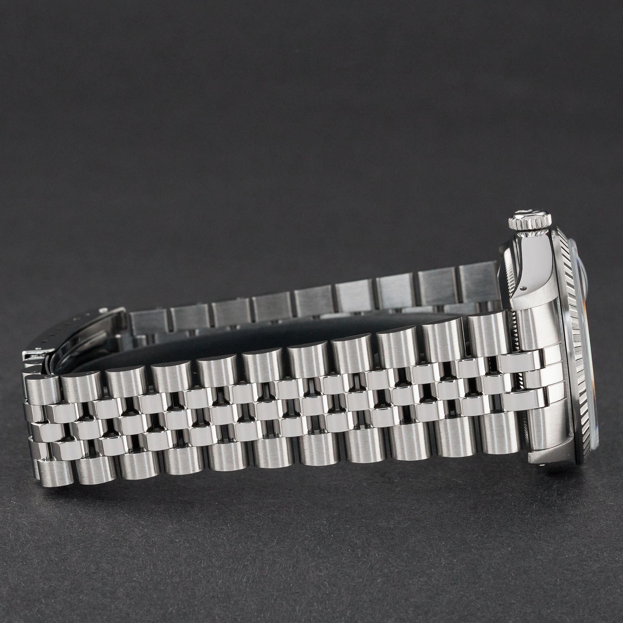- Minor signs of wear such as hairline marks or small surface scratches. Case, bezel, and bracelet retain sharp edges and overall form. May have been professionally polished without affecting the original contours. Fully functional mechanically.
