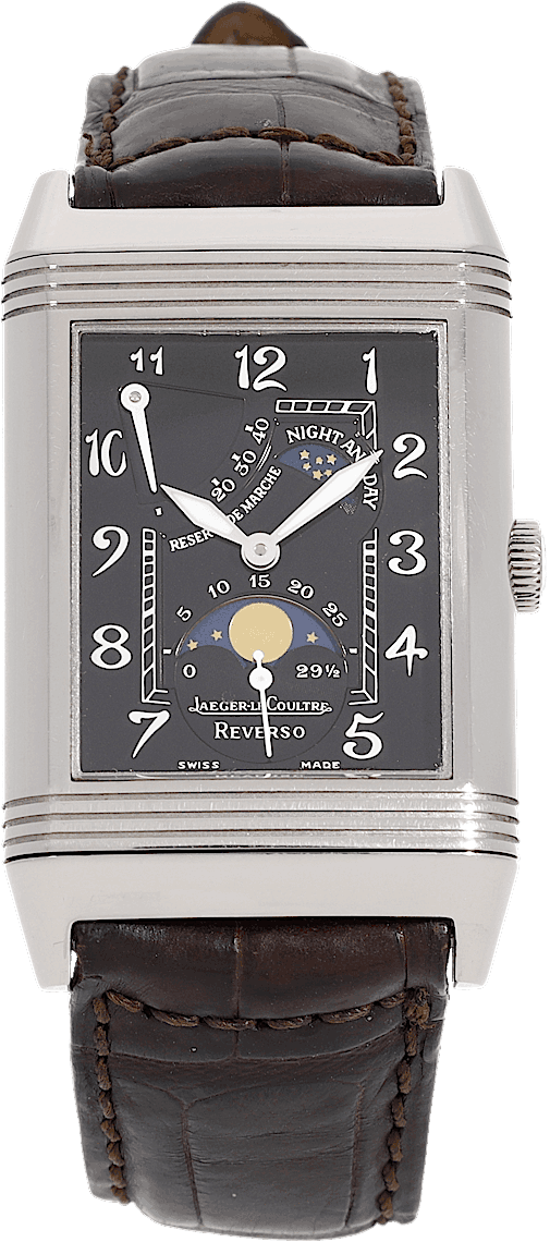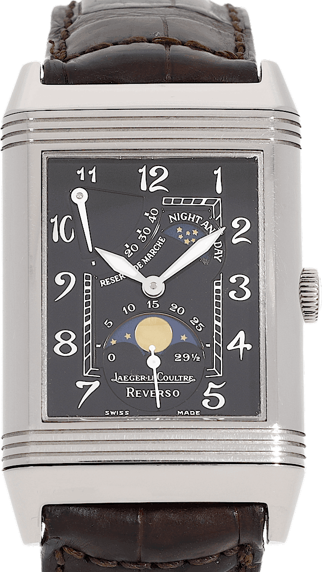 Jaeger-LeCoultre Reverso Night and Day Power Reserve, Reference: 270.3.63, Gender: Female, Size: 26mm, Dial color: Black, Strap material: Alligator Leather, Movement: Manual Wind, Year: 2003, Condition: Previously worn with some signs of usage. The movement is flawless the case has been cleaned. watch tested to ensure full functionality. An inspection by our certified watchmakers guarantees its authenticity., Documents: Original papers, CHRONEXT Certificate