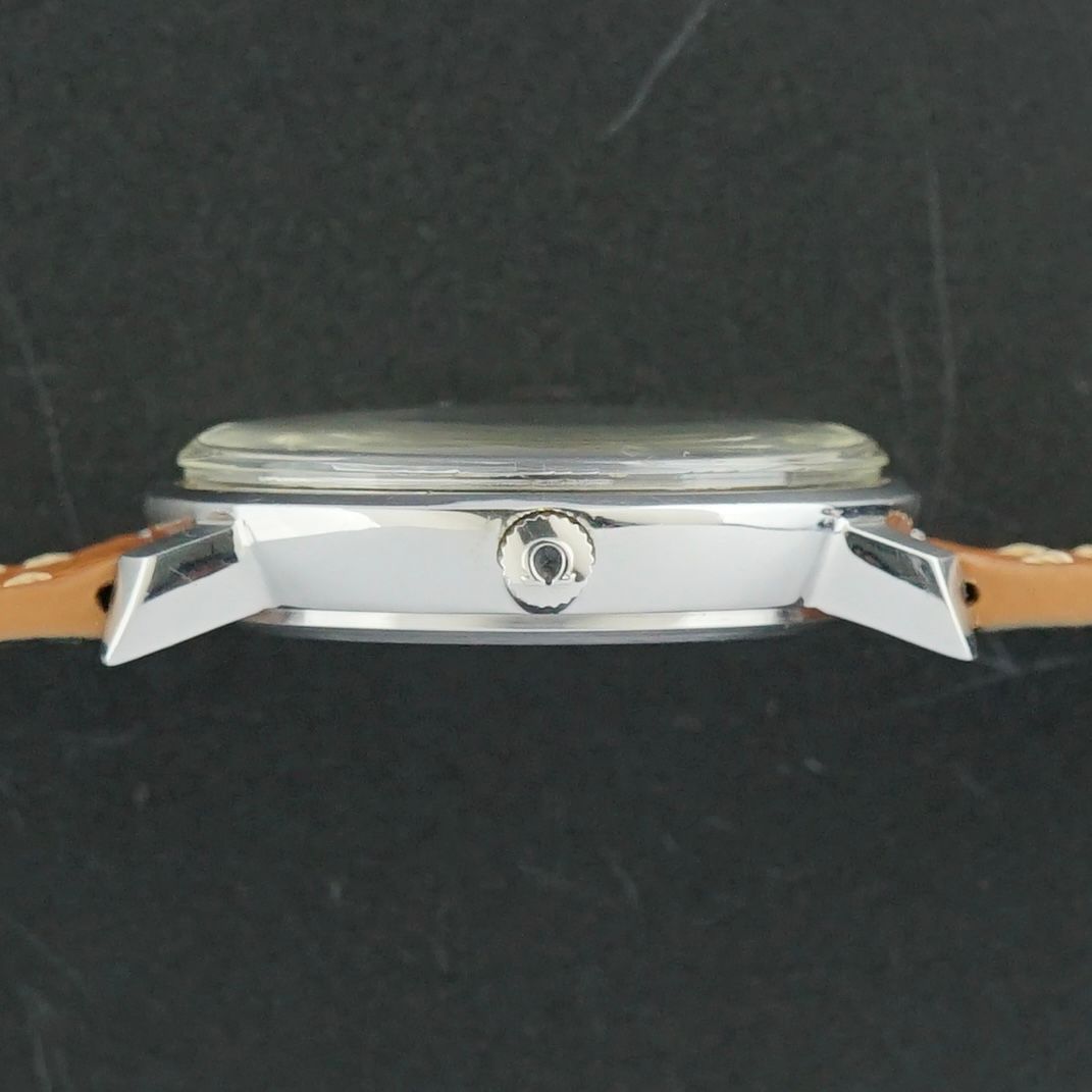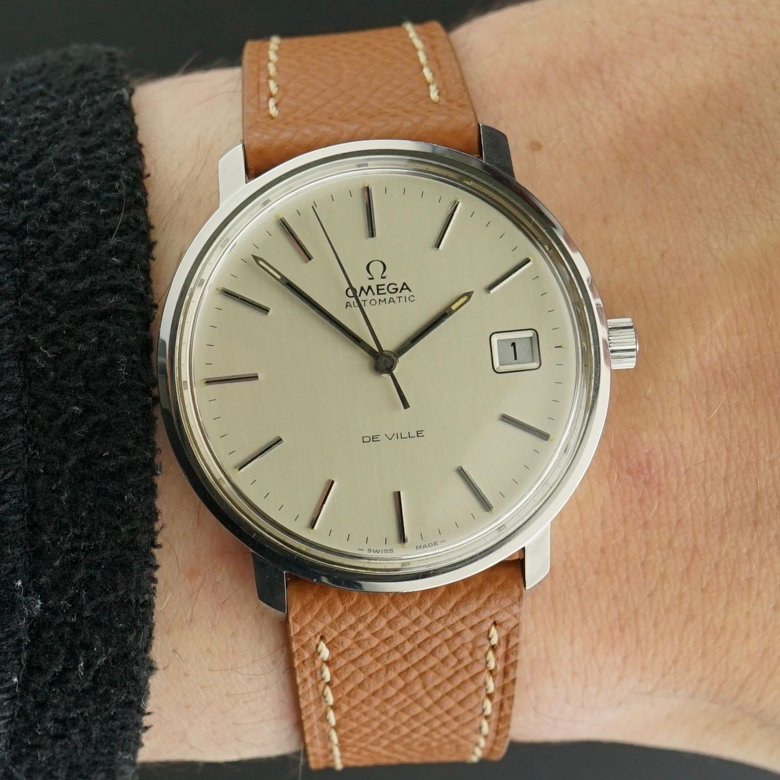 A vintage Omega De Ville produced in 1970, featuring a beautiful white dial with a vertically brushed finish, complemented by elegant silver and black accents, all in perfect condition. The 34.5mm case remains in beautiful shape with its original polish still intact, giving it a sharp and well-preserved appearance. Inside sits the caliber 565 automatic movement, which was serviced in April 2026 and now runs and functions excellently. We have paired this watch with a brown tan leather strap, perfectly matching its vintage character. Overall condition is excellent. Year of production: 1970 Serial number: 31.261.894 Model number: 166.033 Case dimensions. - Width excluding crown: 34,5mm - Width including crown: 37mm - Lug to lug: 37mm - Thickness: 10,5mm Lugs width: 18mm Strap: A brown leather strap. (Fits a 12 to 20cm wrist) Total head-only weight: 30,0g Country of origin: Switzerland Movement: Cal. 565 Automatic Service information: Movement serviced in April 2026. Runs and functions excellently. (~-4s/d, ~340amp, ~0.1ms b/e) Internal code: BTW 1593
