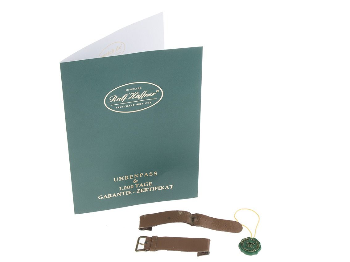 Alpina Eindrücker Chronograph Bi Compax Stahl Handaufzug Armband Leder Gehäuse Edelstahl poliert, Gehäusedurchmesser ohne Krone 42mm, Gehäusehöhe 11,8mm. Lünette Edelstahl kanneliert. Armband Leder braun, Anstoßbreite 20mm, Stiftschließe Edelstahl. Zifferblatt schwarz mit Patina, arabischen Ziffern und Zeigern. Uhrwerk Handaufzug, Kaliber Valjoux Cal. 9. Anzeige von Stunde und Minute über Zeiger aus der Mitte, kleine Sekunde bei 9 Uhr. Plexiglas. Krone geriffelt. Boden Edelstahl. Gewicht der Uhr inklusive Armband 54g, Länge des Armbandes inklusive Gehäuse 155 - 200mm, siehe Bild Nummer 7. Baujahr: 1942, Gehäusenummer: 454XXX, ID: P245840000226HW-15800, Artikelnummer: 10000084651. Inklusive original Armband. Original unpoliert, kann auf Wunsch kostenlos aufgearbeitet werden.. Lieferzeit sofort. Inklusive certified pre owned Siegel / Uhrenpass mit einem Farbbild, der genauen Beschreibung sowie dem Wiederbeschaffungswert der Uhr über 15800,-€ und 1000 Tage Garantie ab Kaufdatum.