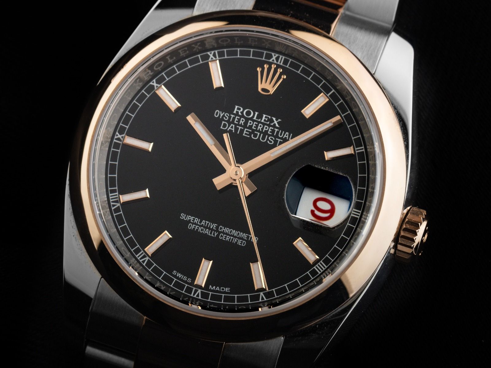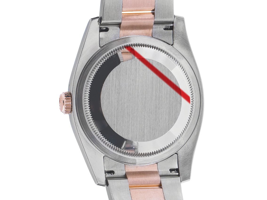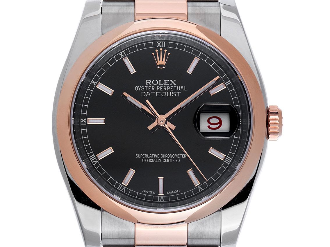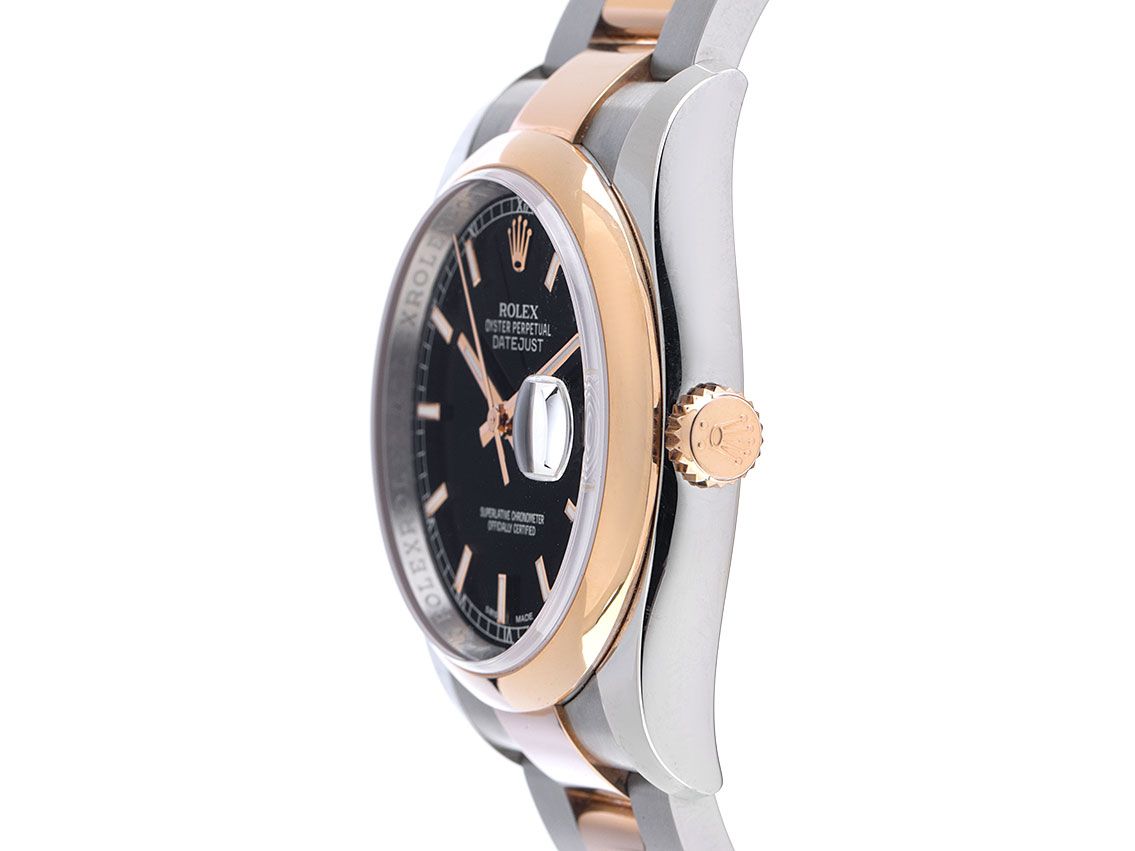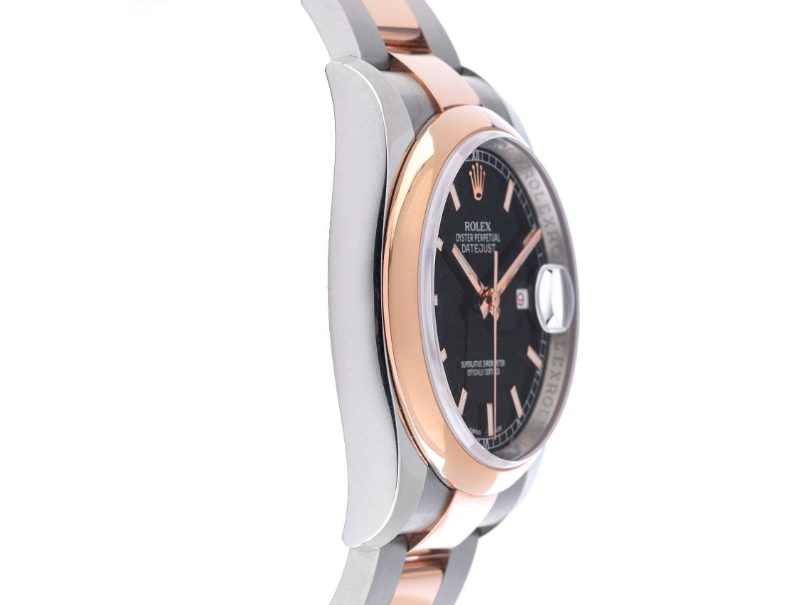 Rolex Datejust Stahl 18kt Roségold Everose Automatik Armband Oyster Stahl 18kt Roségold Everose Gehäuse Edelstahl poliert und satiniert, Gehäusedurchmesser ohne Krone 36mm, Gehäusehöhe 11,4mm. Lünette 18kt Roségold Everose glatt und poliert. Armband Oyster Edelstahl / 18kt Roségold Everose poliert und satiniert, Faltschließe Edelstahl / 18kt Roségold Everose mit Hersteller-Logo. Zifferblatt schwarz mit aufgesetzten in roségoldenen Indexen und roségoldenen Zeigern. Uhrwerk Automatik, Chronometer mit Zeugnis, Rolex Manufakturkaliber 3135 mit 31 Edelsteinen. Anzeige von Stunde, Minute und Sekunde über Zeiger aus der Mitte mit Sekundenstopp zur sekundengenauen Einstellung der Uhrzeit, Datumsanzeige mit Schnellverstellung unter Glaslupe bei 3 Uhr. Saphirglas kratzfest. Krone verschraubbar mit Hersteller-Logo. Boden Edelstahl verschraubt. Gewicht der Uhr inklusive Armband 133g, Länge des Armbandes inklusive Gehäuse 170mm, siehe Bild Nummer 8. Referenznummer: 116201, Gehäusenummer: 514J7XXX, ID: P2942179000426HW-13500, Artikelnummer: 10000085751. Mit Gangkontrolle und kompletter äußerlicher Aufarbeitung von April 2026. Original Rolex Box mit Umkarton und Garantie Papiere vom 4 April 2018, LC 710 / USA, sowie Beschreibung, Ledermäppchen, Rolex Chronometer-Siegel, Tag, und Watchregister Auszug von April 2026, The Watch Register Zertifikat / ohne Eintrag (Internationale Datenbank für verlorene oder gestohlene Uhren), Full Set. Superschnäppchen, Kapitalanlage mit Wertsteigerungspotential, sehr seltenes Sammlerstück, aus erster Hand, fast nicht getragen. Wie Neu. Lieferzeit sofort. Inklusive certified pre owned Zertifikat / Uhrenpass mit einem Farbbild, der genauen Beschreibung sowie dem Wiederbeschaffungswert der Uhr über 13500,-€ und 1000 Tage Garantie ab Kaufdatum.