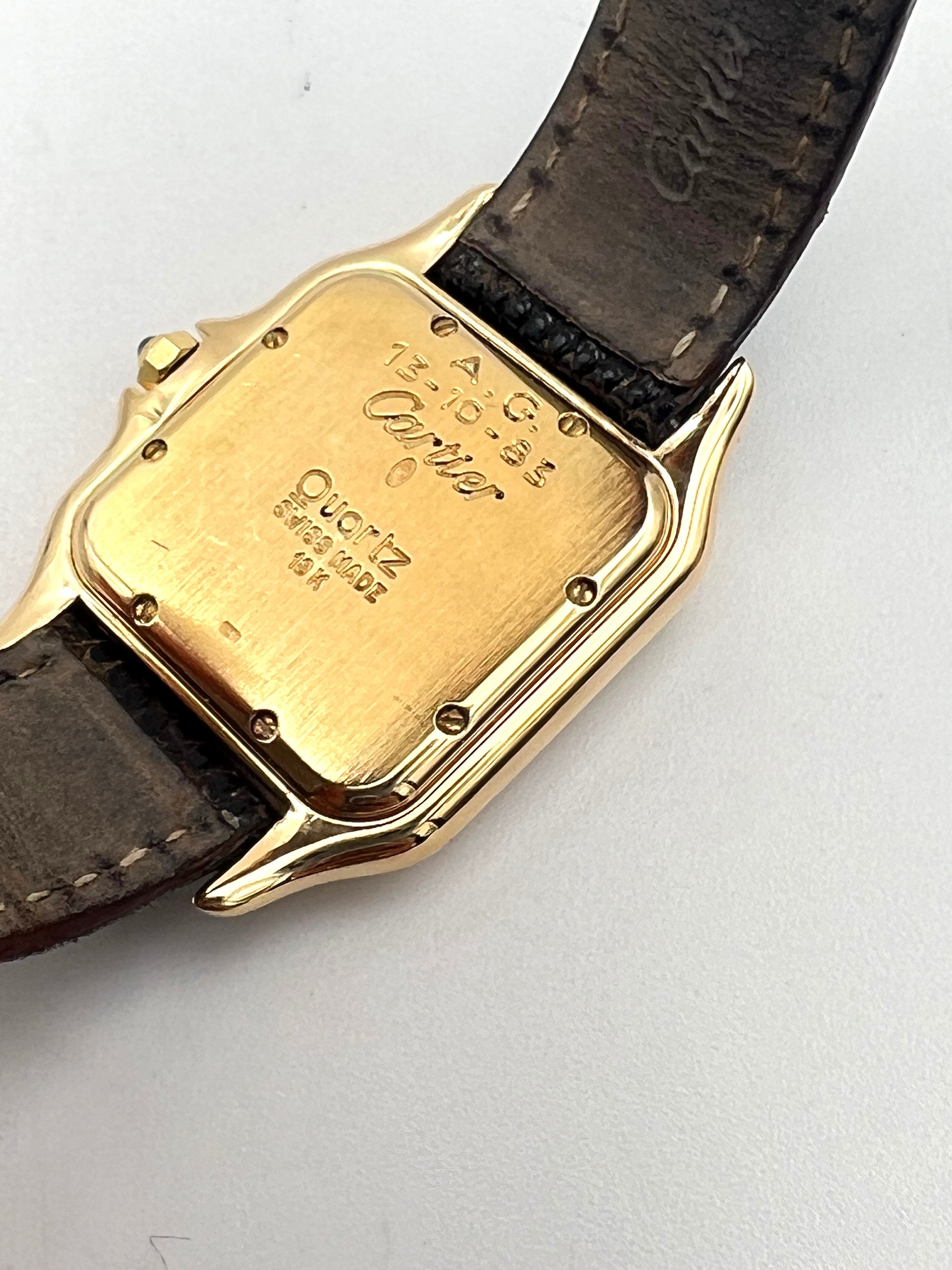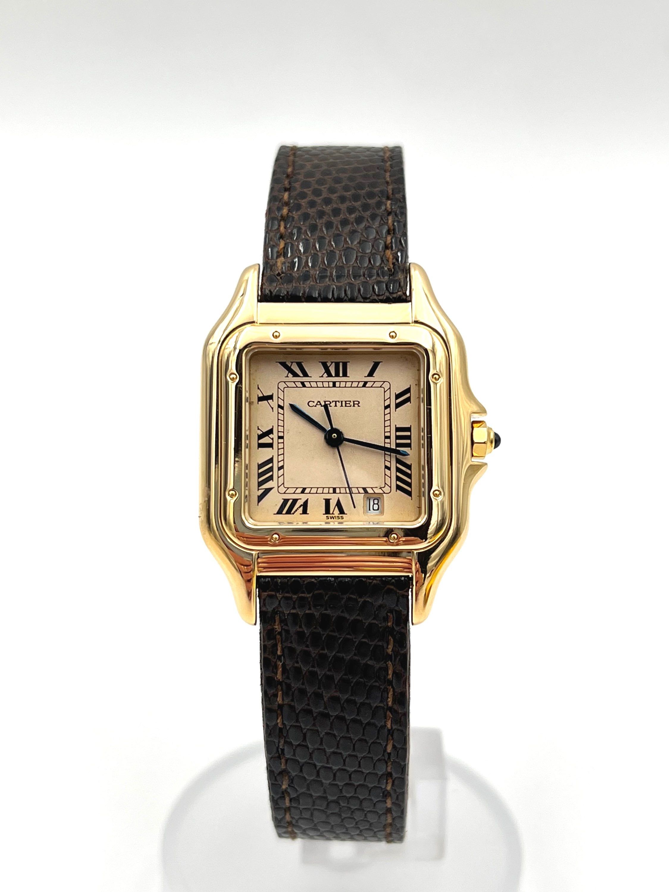 The Iconic Cartier Panthère in 18k Gold with ivory dial and Leather brown strap. Box: No Papers: No Reference Number: 1740 CASE & DIALCase Size: 22mm Case Material: 18k GoldDial Color: IvoryWater Resistance: Yes Movement: Automatic Complications: Yes STRAP/BRACELETStrap/Bracelet Material: Brown Leather Strap Buckle Type: Folding Clasp 18k Gold
