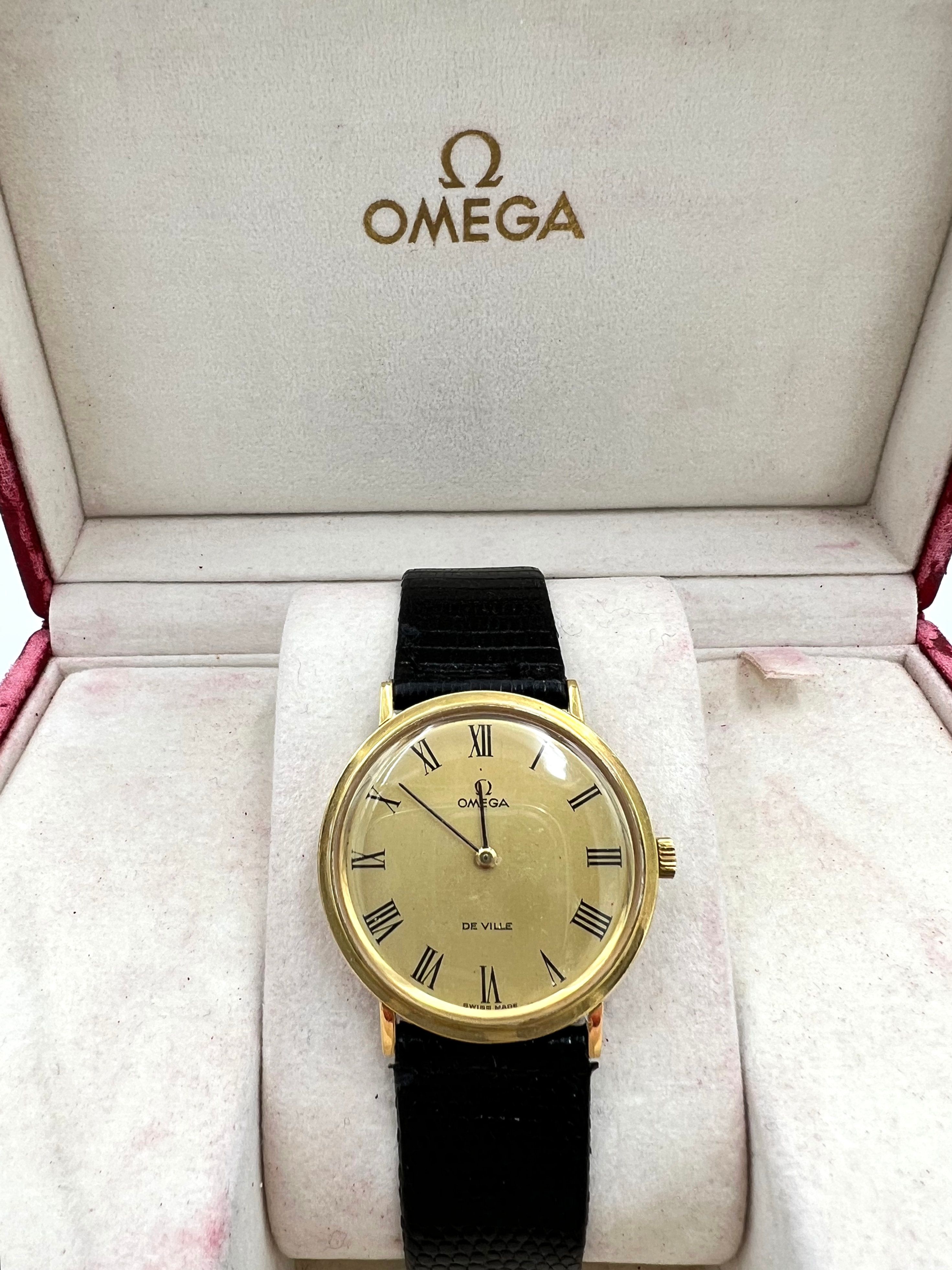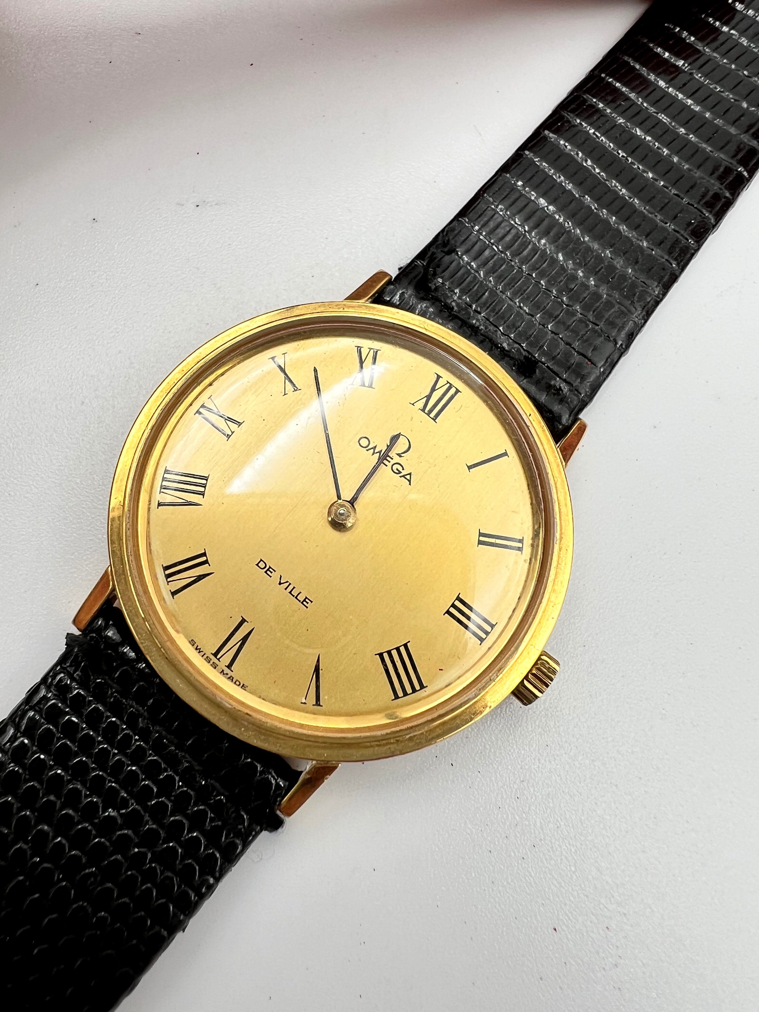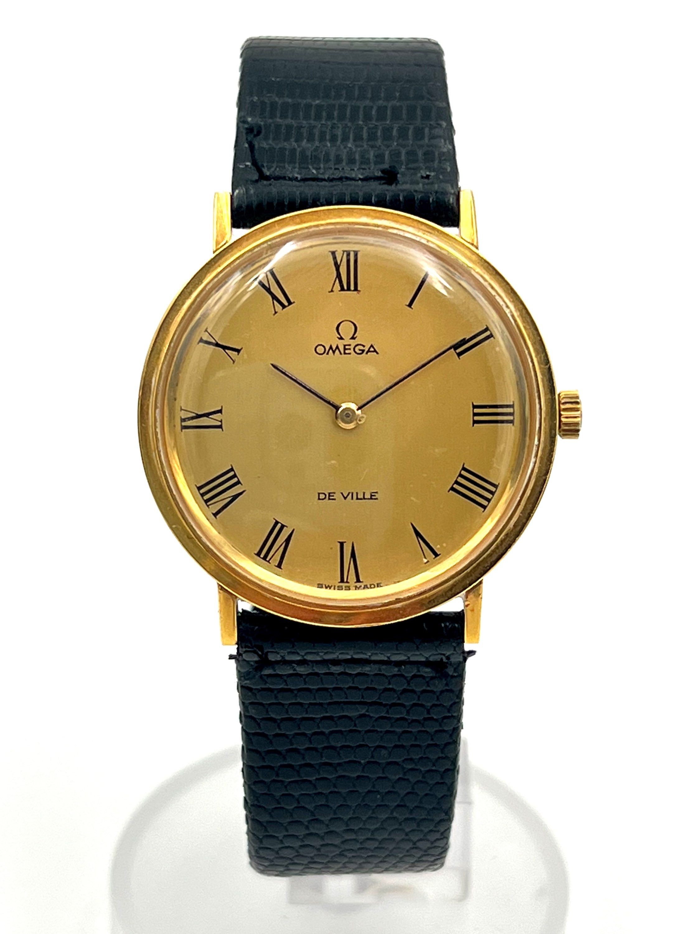 Omega De Ville 14k Gold Vintage WatchCondition: Good CASE & DIALCase Size: 33mmCase Material: 14k GoldDial Color: GoldGlass: Sapphire glassWater Resistance: No Movement: Manual Winding Complications: No STRAP/BRACELETStrap/Bracelet Material: Leather Band Color: Black (Not Omega)Buckle Type: Buckle