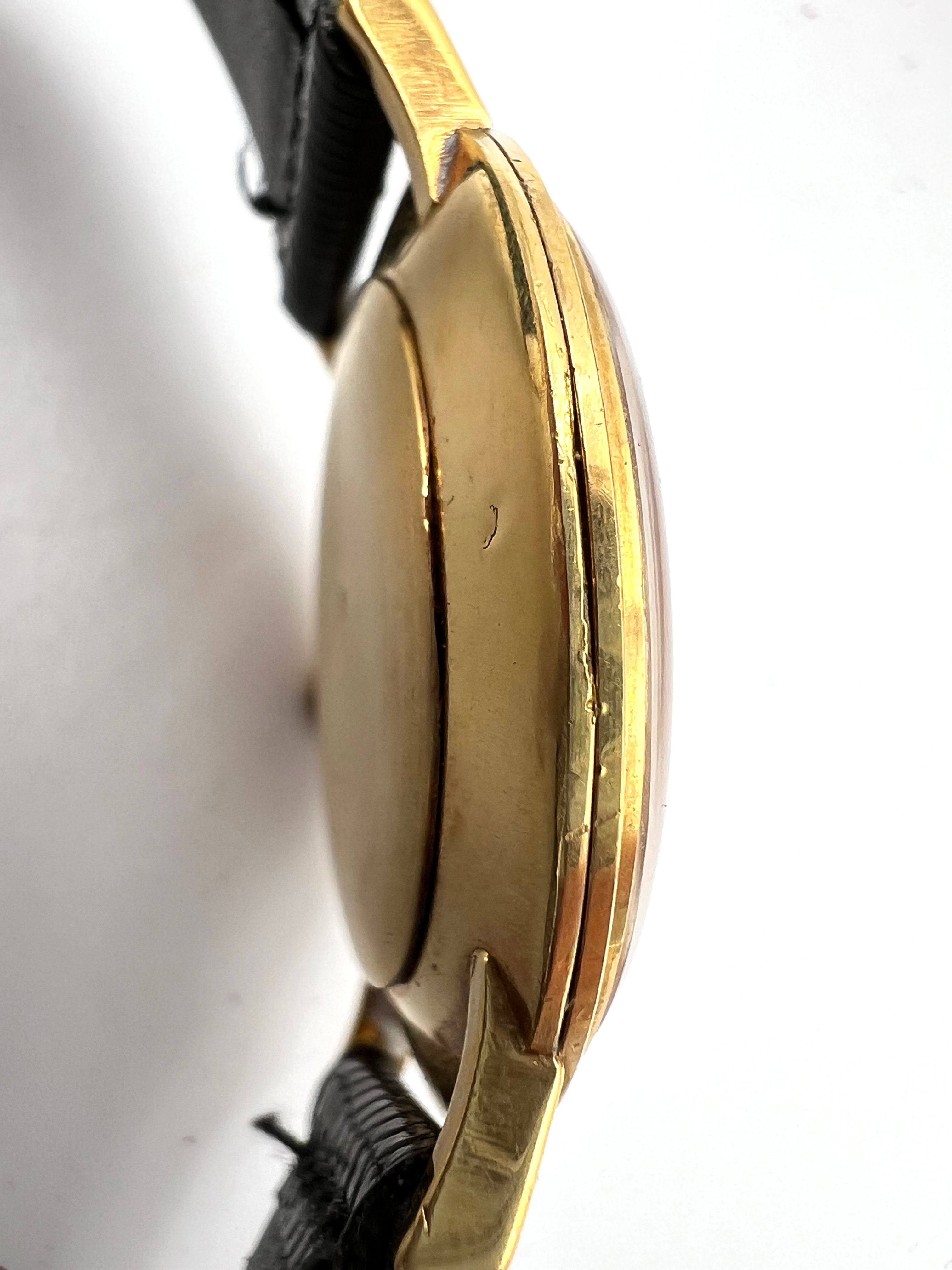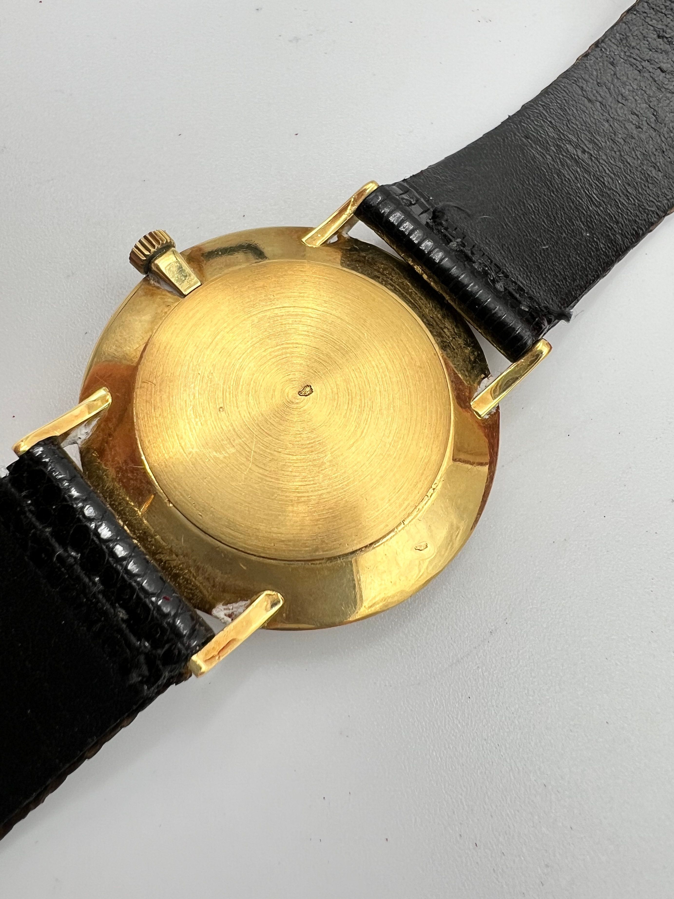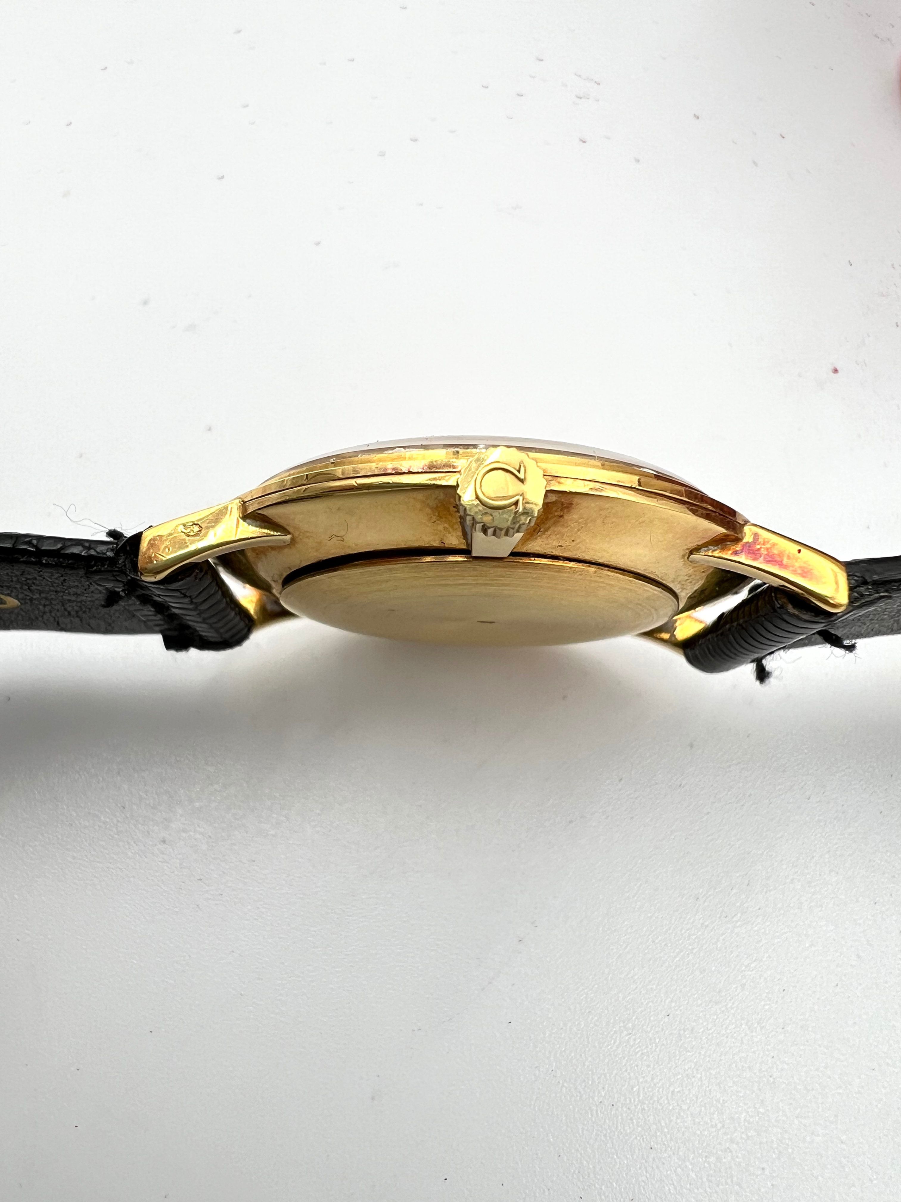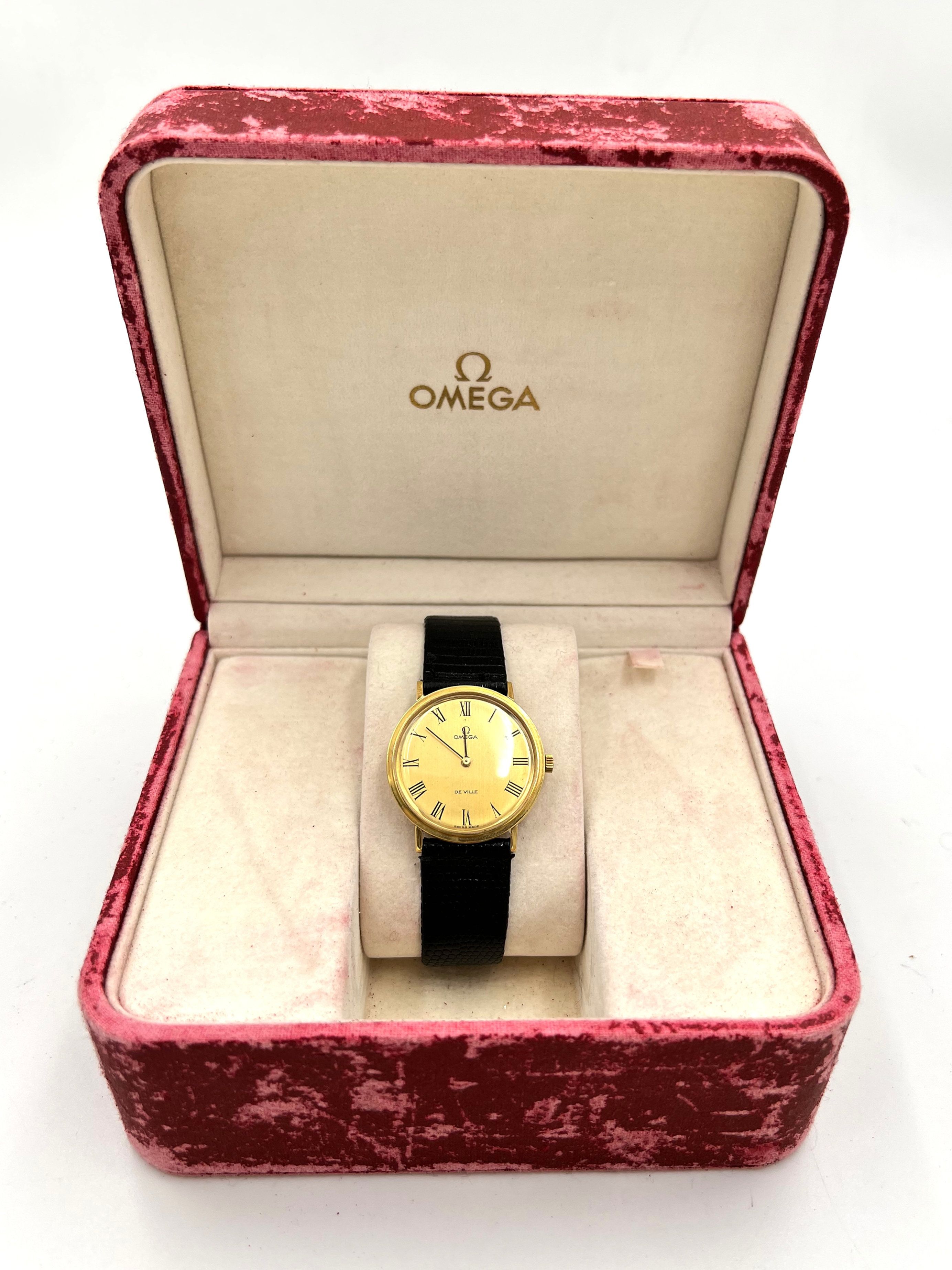 Omega De Ville 14k Gold Vintage WatchCondition: Good CASE & DIALCase Size: 33mmCase Material: 14k GoldDial Color: GoldGlass: Sapphire glassWater Resistance: No Movement: Manual Winding Complications: No STRAP/BRACELETStrap/Bracelet Material: Leather Band Color: Black (Not Omega)Buckle Type: Buckle