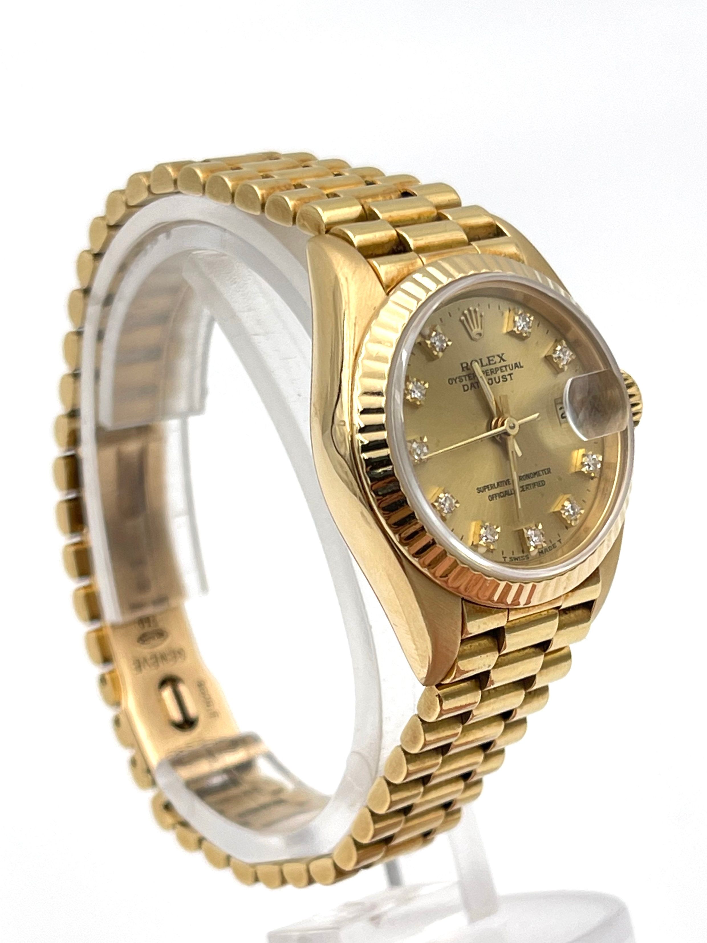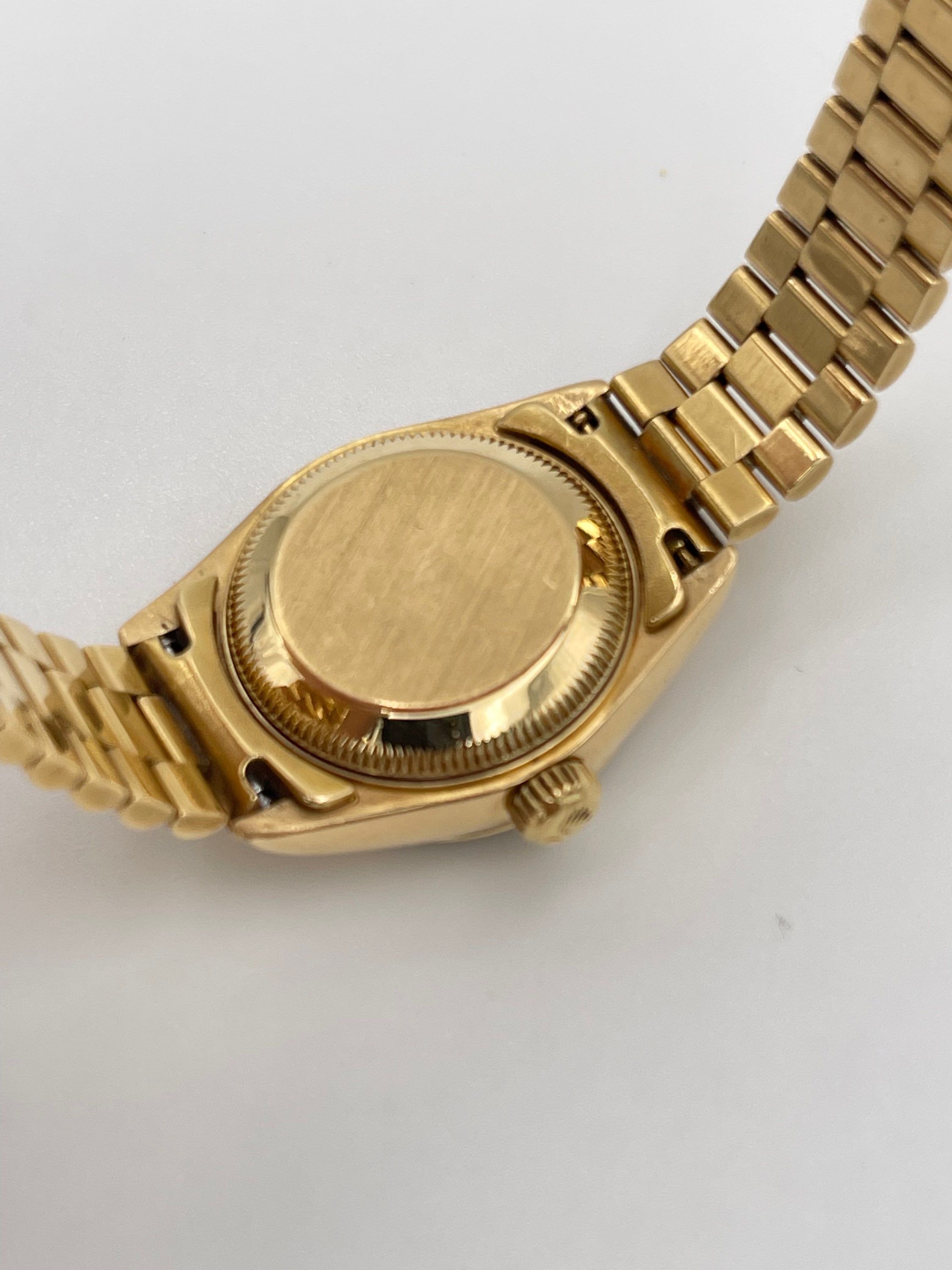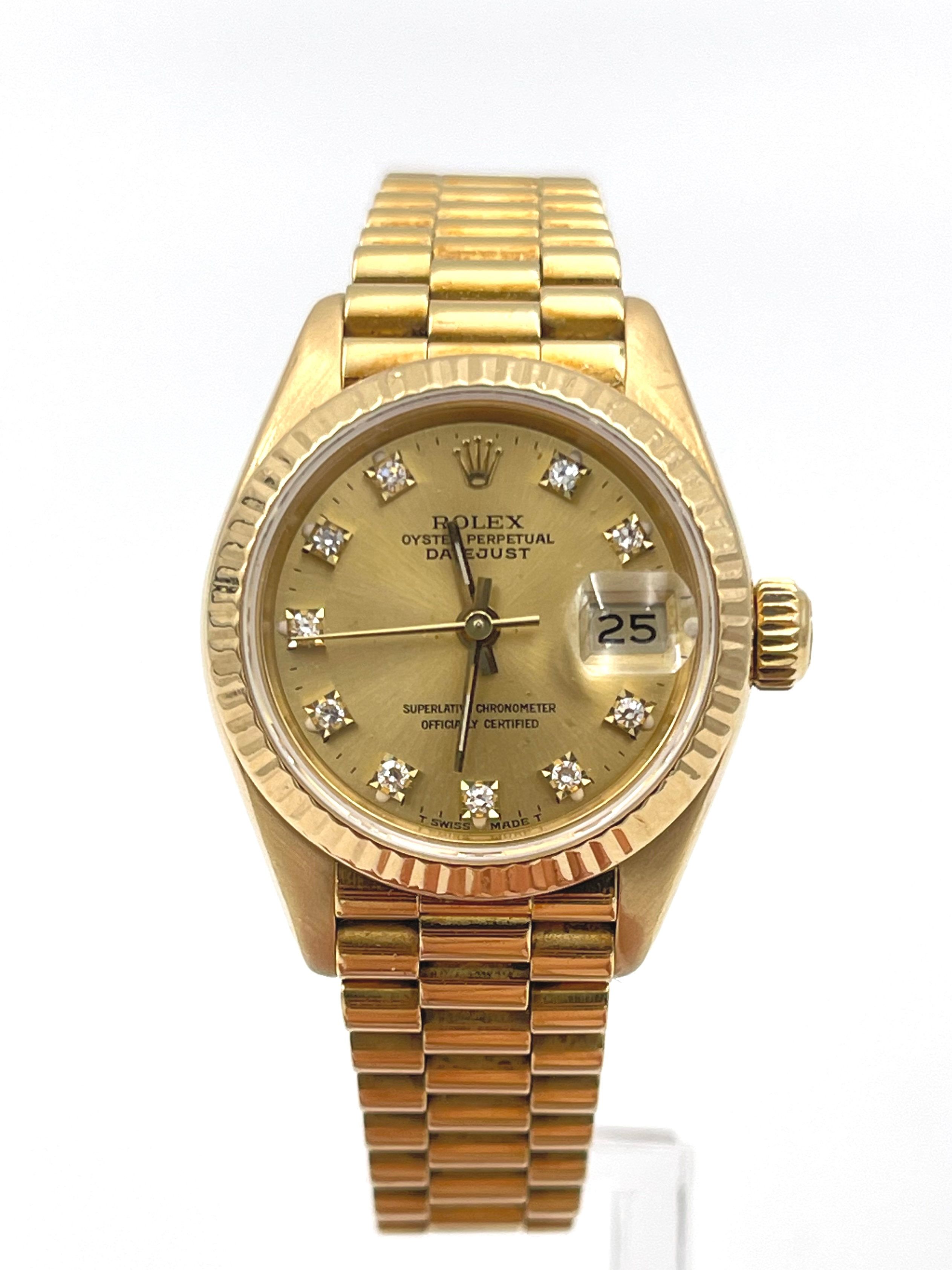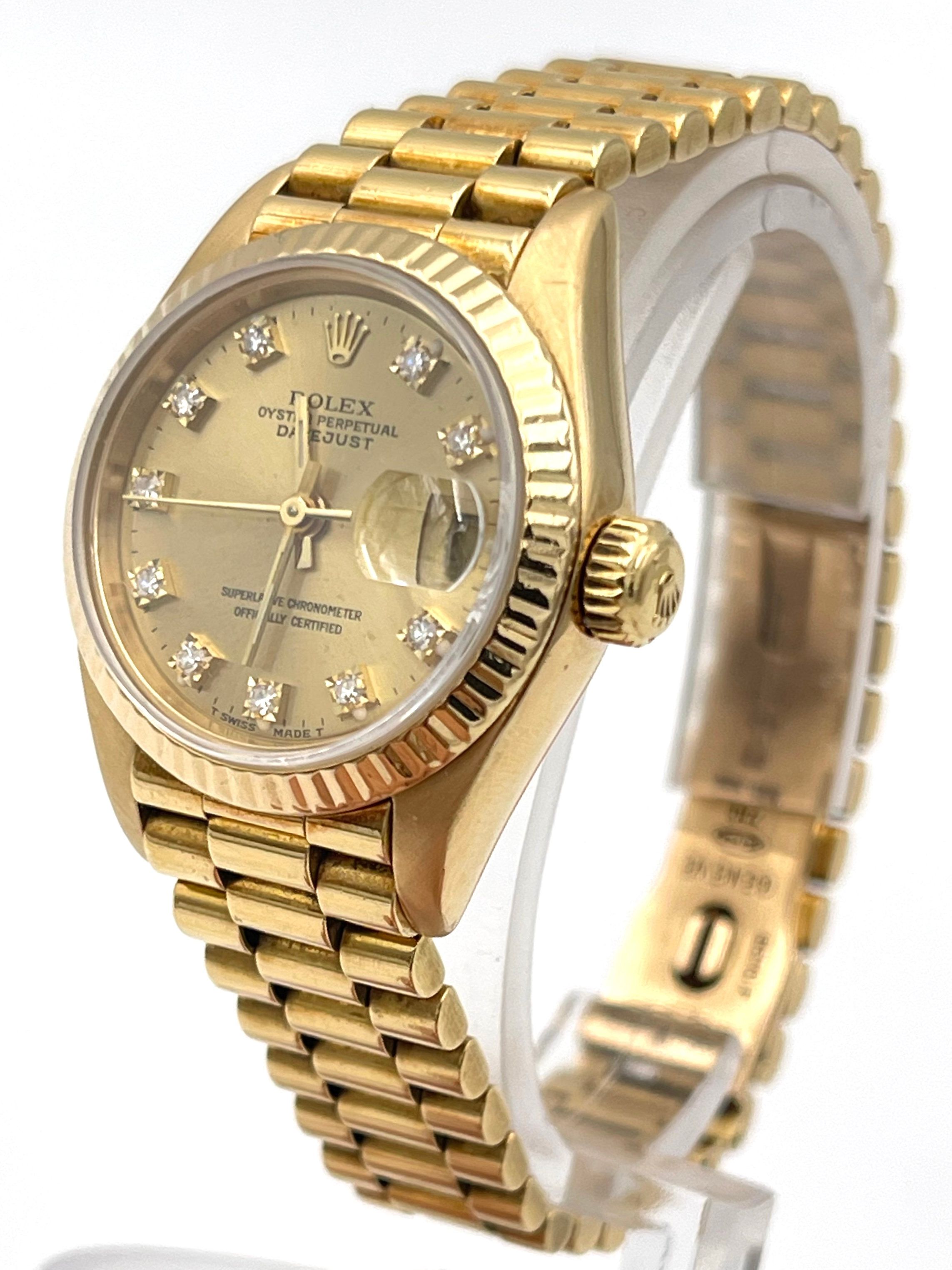 A beautiful ladies 18k Gold Rolex Datejust with diamonds in the dial. Comes with original box and papers.Condition: Very good WATCH DETAILSReference Number: 69178Year: 1996CASE & DIALCase Size: 26mmCase Material: 18k GoldDial Color: GoldHours Markers: DiamondsWater Resistance: Yes Movement: AutomaticComplications: Date STRAP/BRACELETStrap/Bracelet Material: 18k GoldBracelet type: President Buckle Type: Folding Clasp