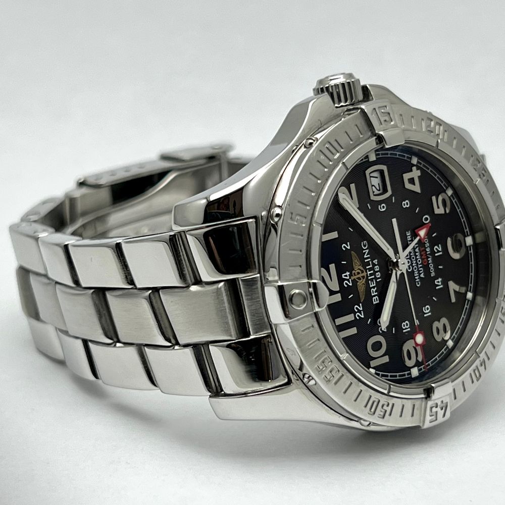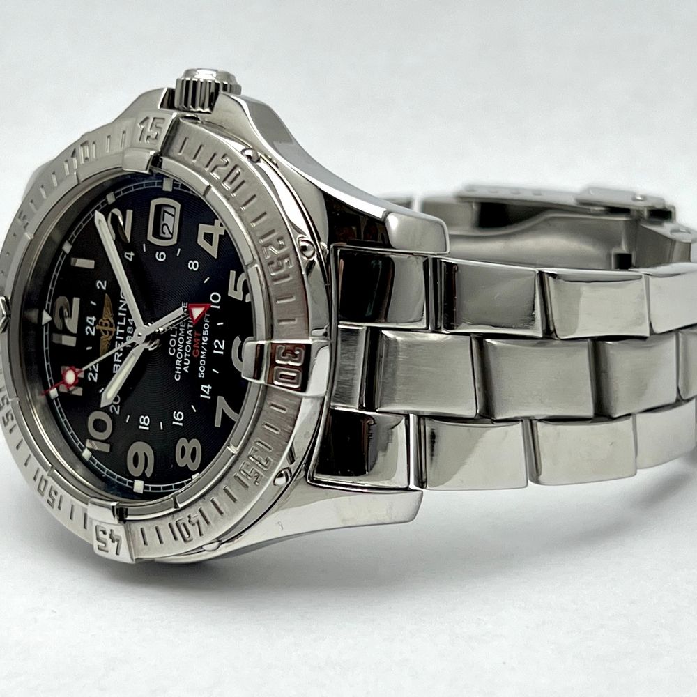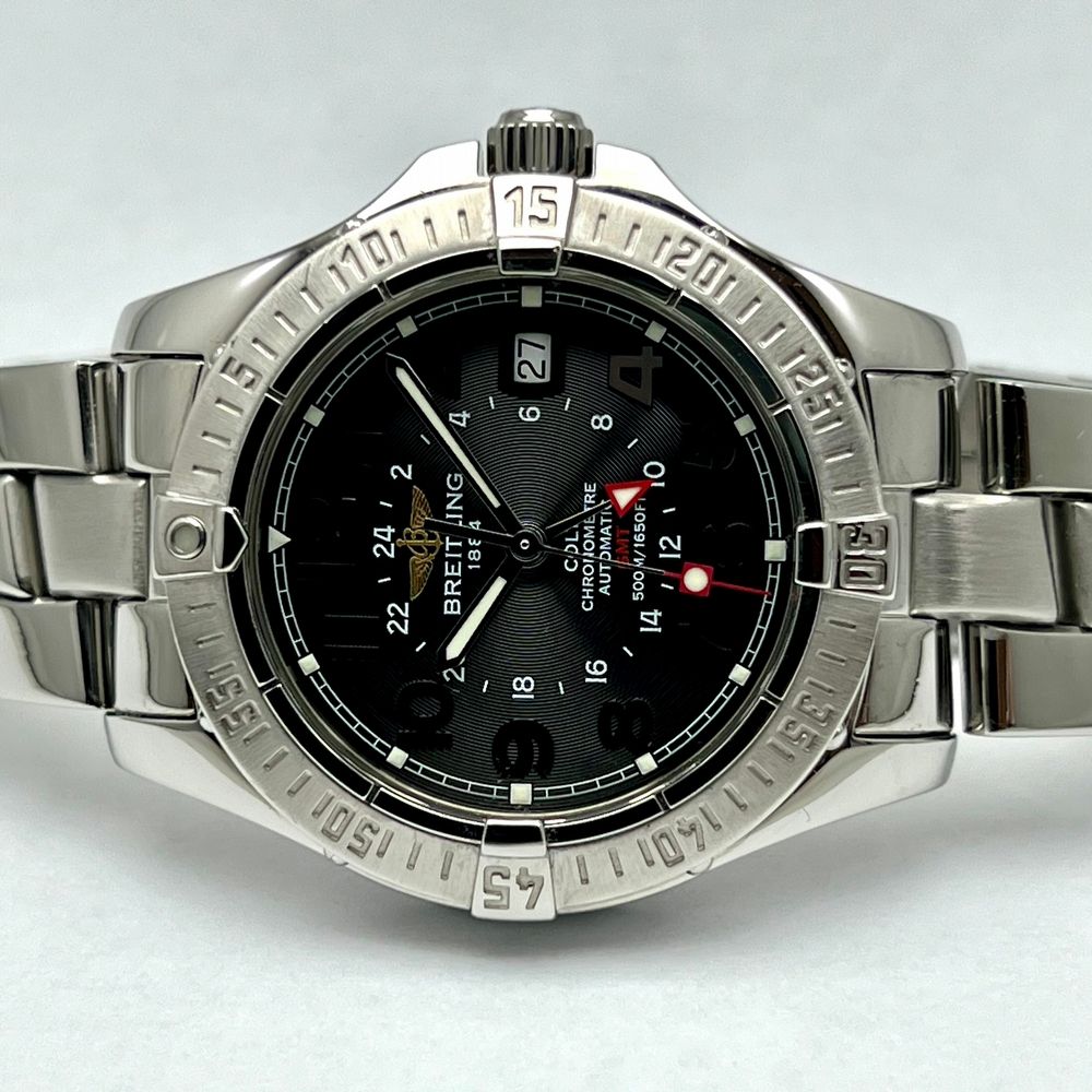 This Breitling Colt GMT has the great Breitling look and the beautiful black/gray dial. Wearable on any wrist with a 40.5mm case and the Professional II steel bracelet. This watch is distinguished by the fact that a second timezone is indicated by an additional red pointed hour hand associated with a 24-hour indication. Other functions include a date, hours, minutes and center-seconds and antireflection coated sapphire crystal.