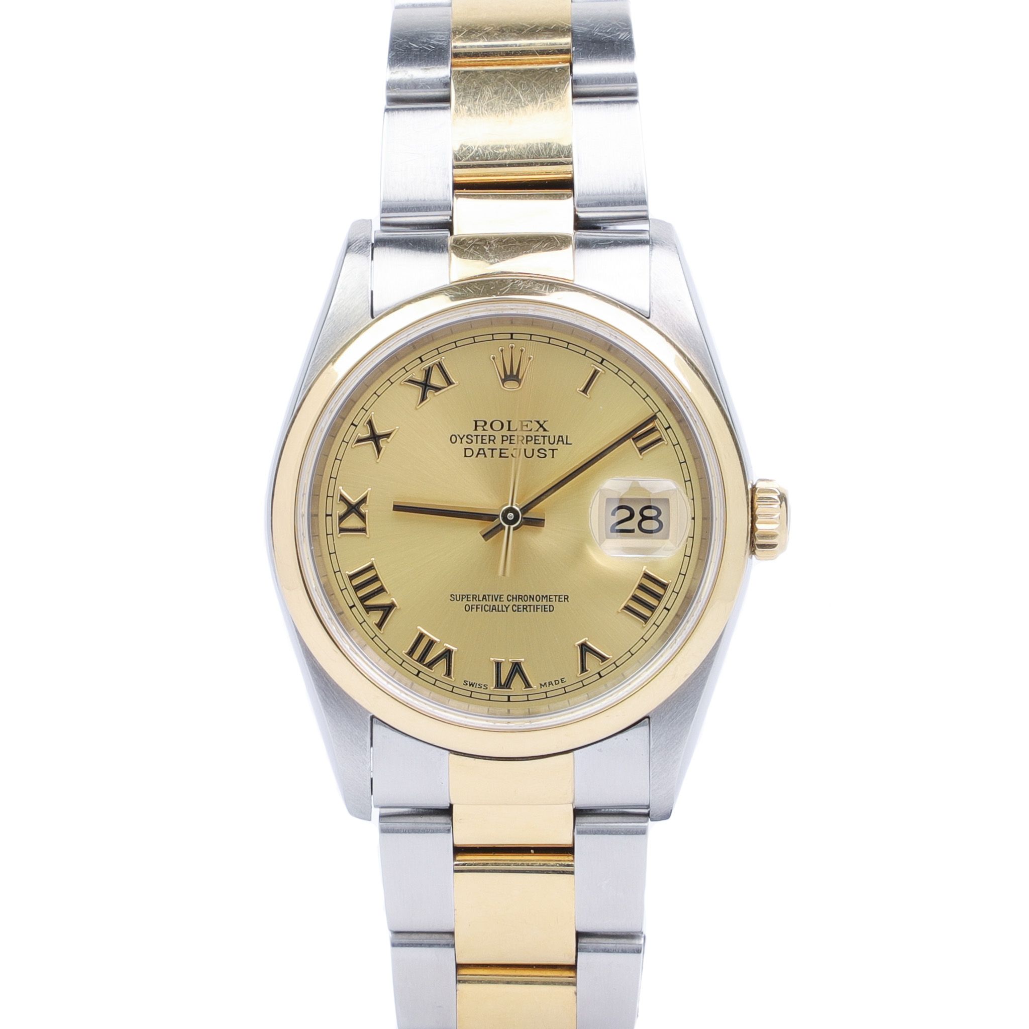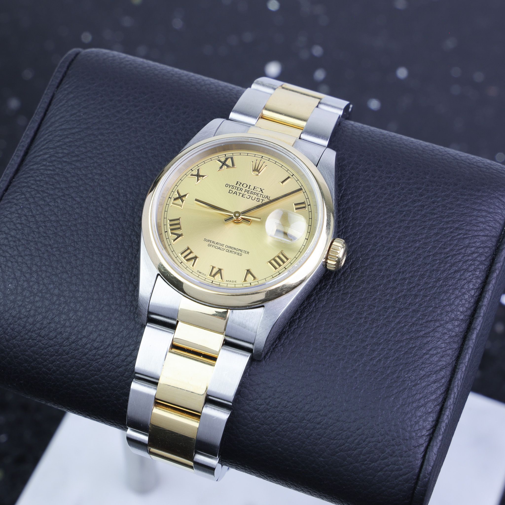 Rolex Datejust 36 reference 16203 featuring a yellow-gold smooth bezel and a champagne sunburst dial. The watch is fitted on a two-tone oyster bracelet and comes complete with box and papers.