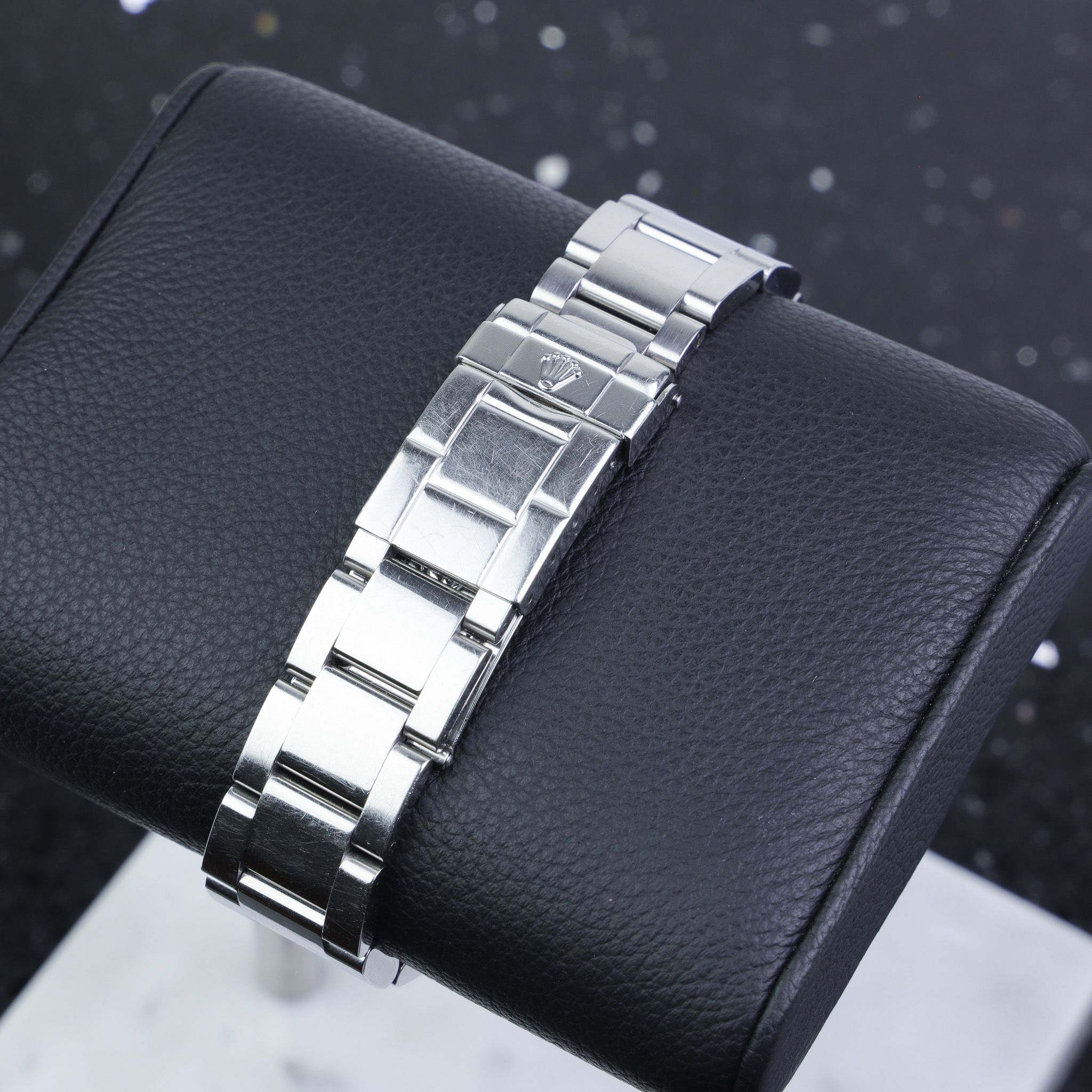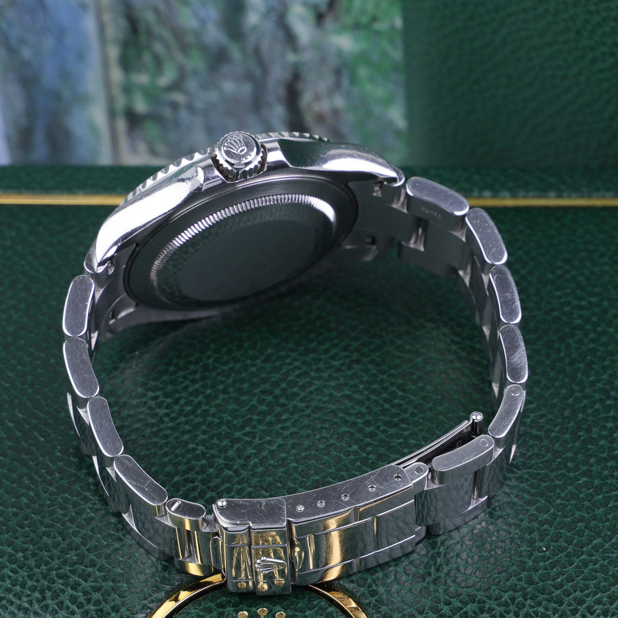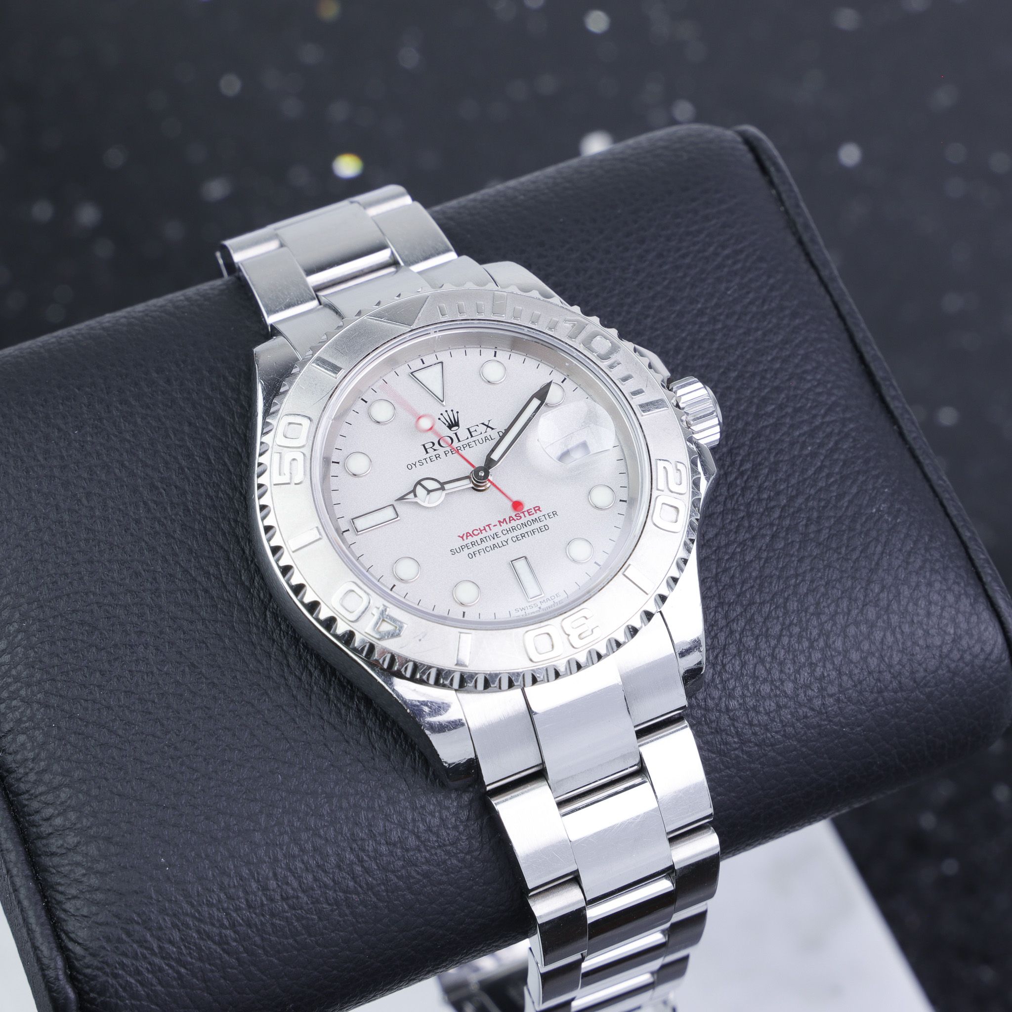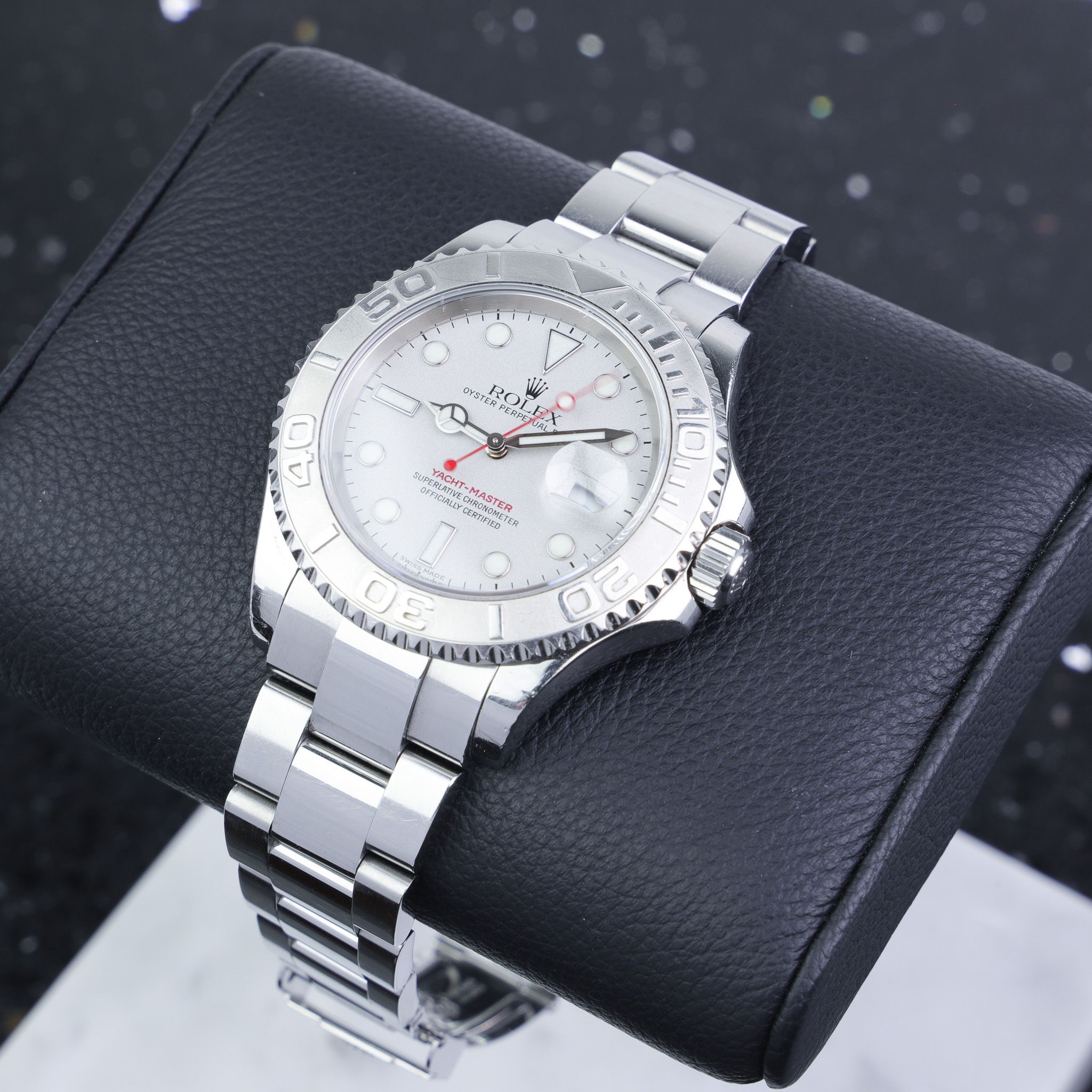 A classic and sporty Rolex Yacht-Master reference 16622 complete with box and papers dated 2003. The watch is in overall good condition with natural signs of wear. It is presented on a stainless steel Oyster bracelet and has a platinum dial with a stunning luster and sheen as light hits it. It is also equipped with a bidirectional rotating bezel with a platinum insert.
