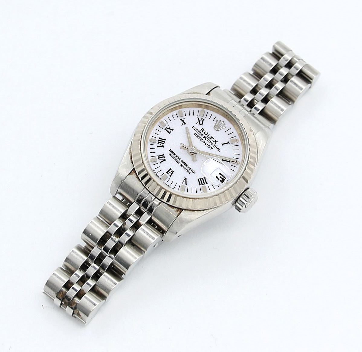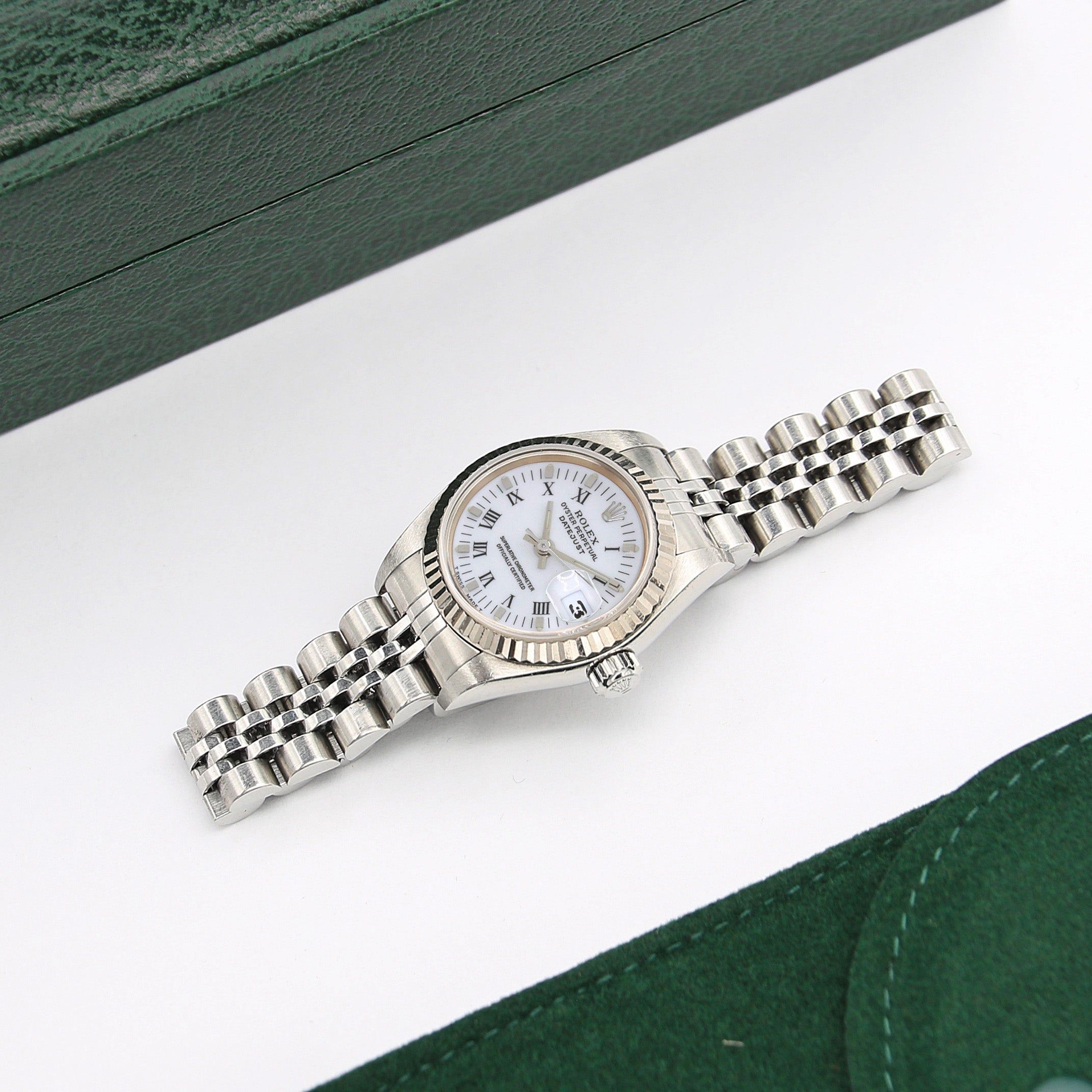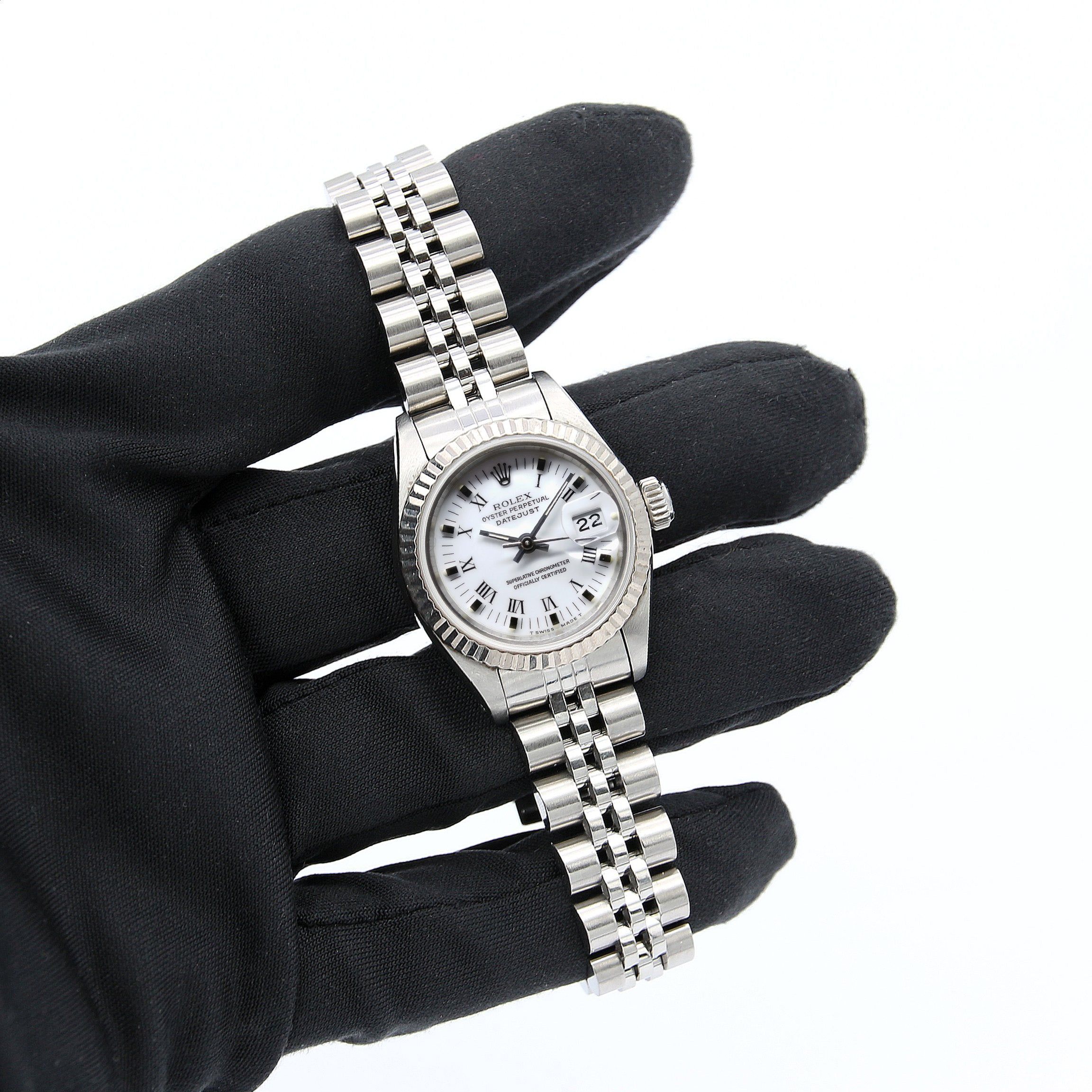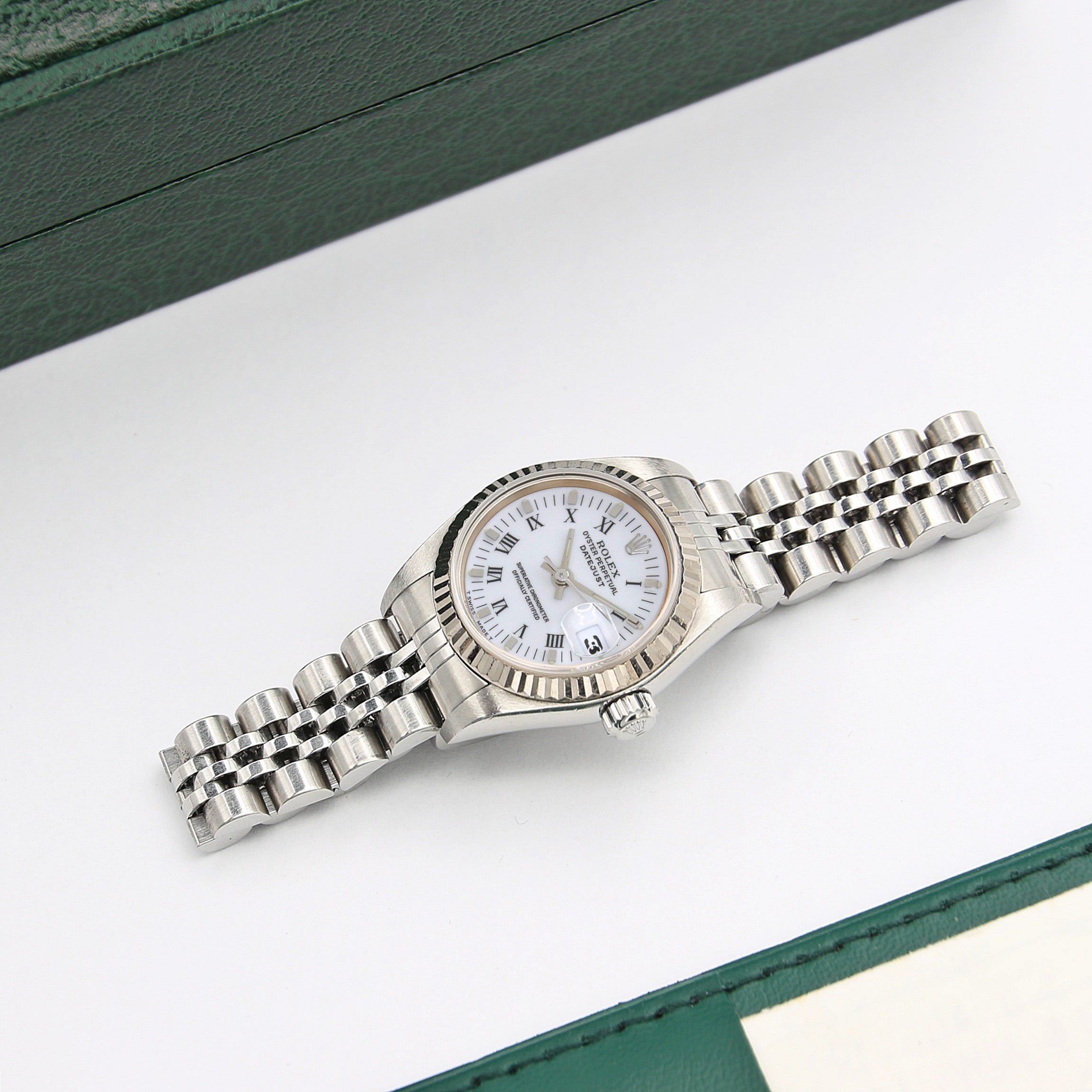 For sale at Debonar Watches: pre-owned Rolex Oyster Perpetual Datejust Ref. 69174, full set, with a feminine white dial with small roman numbers and lines minutes. Fine, center seconds, self-winding automatic, water-resistant, stainless steel and 18K white gold lady's wristwatch with date and a stainless steel Rolex Jubilee bracelet with deployant clasp.The Lady-Datejusts are all about delicacy and finesse, something to accentuate a sophisticated outfit. BRAND ROLEX MODEL DATEJUST LADY REFERENCE 69174 CASE MATERIAL STEEL MOVEMENT AUTOMATIC DIMENSION 26 MM DIAL WHITE ROMAN (SMALL - LINES) BEZEL 18K GOLD CRYSTAL SAPPHIRE BRACELET TYPE JUBILEE BRACELET MATERIAL STEEL BRACELET LENGHT 16 CM ORIGINAL BOX YES ORIGINAL PAPERS YES YEAR APPROX. THE '90s CONDITION VERY GOOD