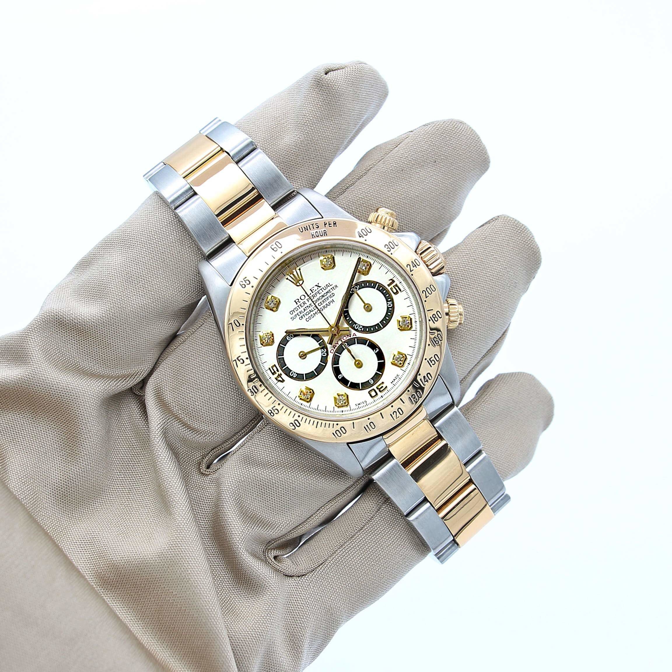 For sale at Debonar Watches: pre-owned Rolex Daytona 16523, full set. This amazing Rolex watch sports a white dial with diamonds. This reference better known as the Zenith Daytona: it takes its nickname from the fact that it’s powered by a Zenith El Primero calibre.It wasn’t that long ago that Rolex still relied on 3rd-party suppliers for certain things. Particularly movements, which it then modified in-house.The dial of this Daytona 16523 exhibits a stunning gold sunburst pattern with black registers and bright red "Daytona" script. All appliqué indices are rendered in 18-karat yellow gold to match the dial and 18-karat yellow gold hands. This Zenith powered Rolex Daytona features a 40mm stainless steel case with an 18k yellow gold bezel surrounding a gold dial on a Rolex 904L stainless steel and 18k yellow gold Oyster bracelet with folding buckle.Functions include hours, minutes, small-seconds, 52-hour power reserve, COSC Swiss chronometer certification, 100-meter water resistance, and a column wheel chronograph. The watch also measures 12.3mm in thickness and 47.2mm from lug-to-lug. BRAND ROLEX MODEL DAYTONA REFERENCE 16523 CASE MATERIAL GOLD/STEEL MOVEMENT AUTOMATIC DIMENSION 40 MM DIAL WHITE W/DIAMONDS BEZEL GOLD/STEEL CRYSTAL SAPPHIRE BRACELET TYPE OYSTER BRACELET MATERIAL STEEL ORIGINAL BOX YES ORIGINAL PAPERS YES YEAR APPROX. '90s CONDITION VERY GOOD