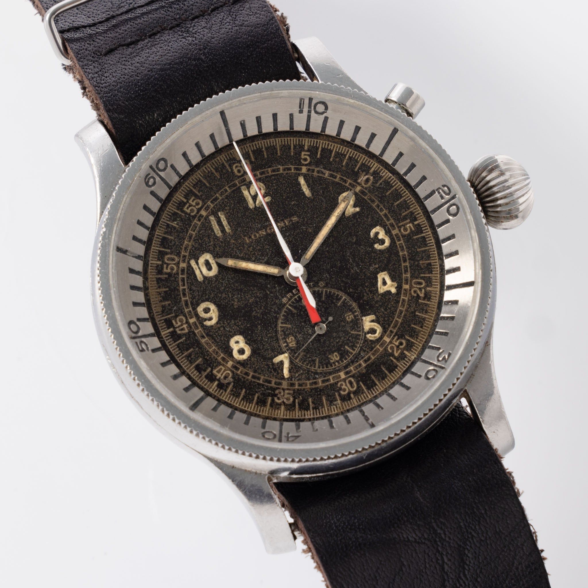 They say big is beautiful…well, it’s certainly true in this case!This is a very Collectible Longines monopusher watch with all the hallmarks of the brand’s dedication to offering interesting pilots’ watches in the mid-20th century, as demonstrated by the bold Arabic hours and large onion winding crown.The steel case measures a huge 47.5mm and has a single chronograph pusher. The black dial has luminous Arabic numerals, an inner rotating bezel calibrated to 60 minutes and two “running seconds” hands - one for counting seconds and the other one is actually a minute counter. The watch will come on the pictured Nato strap. The movement has been fully serviced by our watchmaker. The extract states that this watch was invoiced on 31 March 1951 to the company Knyath, which was at that time the agent for Israel.This is a super cool and still under the radar watch that we’re sure you guys will love. Please arrange a visit to our lounge or a call to discuss this lovely Longines some more!Specifications:- Longines Chronostop ref 5824- 47.5mm case- Mono-pusher chronograph with large onion crown- Case number 2x- Black dial with painted hours and inner bezel- Calibre 1268Z stop second movement- Movement number 764xxxx dating to the early 1950s- With Longines Extract from the Archives - Comes on the pictured Nato strap- Fully serviced by our watchmaker- One-year mechanical warranty- Free worldwide Fedex Priority shipping This watch has been certified at Certifiwatch under registration number CF-0104339