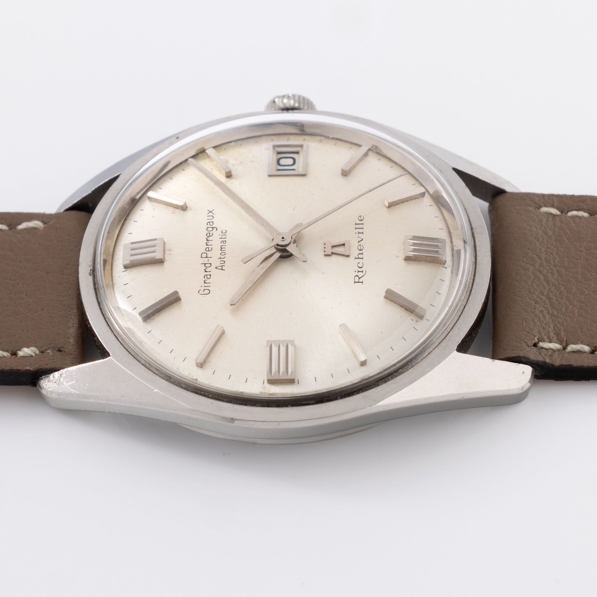Today, we have a charming 35mm steel dress watch from Girard Perregaux, one of the oldest still-existing watch manufacturers, in business since 1791! This model is called “Richeville” and was only made for a couple of years in the 1960s. As the story goes, the reason why GP stopped using this Richeville name is due to the American saying “Coming from Richville,” which is not very positive, BUT Gp started to revive the model again ! This watch features a beautiful silver soleil dial with unusual indexes at 6 and 9, and a date window at 3 o’clock with no lume. The watch is powered by a GP automatic movement and has been fully checked and regulated by our watchmaker. The watch comes with the photographed Bulang and Sons strap. This "Richeville" is a refined, low-key dress watch that speaks volumes about your sophisticated taste. Don't miss out! Specifications: - Girard Perregaux “Richeville “ ref 8445 - 35mm steel case - Date function, funky indexes - Automatic GP 'Gyromatic ' movement - Silver sunburst dial with date function - Movement serial 321xxxx dating to the 1960s - Bulangandsons leatherstrap - Fully checked by our watchmaker - One-year mechanical warranty- Free worldwide Fedex Priority shipping This watch has been certified at Certifiwatch under registration number CF-0104559