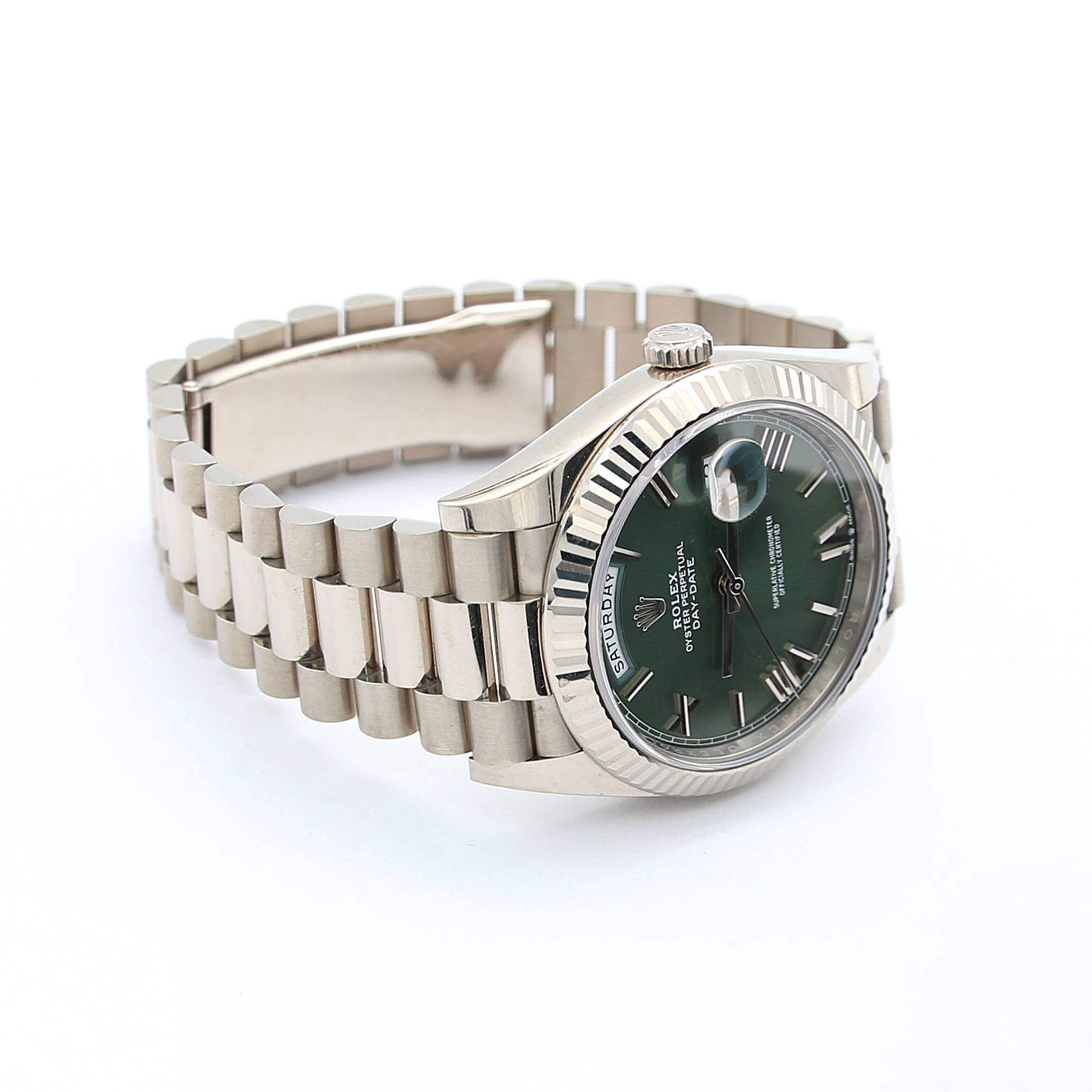 For sale at Debonar Watches: pre-owned Rolex Day-Date ref. 228239, full set.From its 40mm Oyster case to its President bracelet to its fluted bezel, this particular Day-Date 40 is made almost entirely in 18k white gold. It’s worth noting for those who don’t already know, that Rolex produces their own gold at their in-house foundry. The Rolex Day-Date, often referred to as the “Rolex President”, is one of the brand’s signature timepieces. The traditional Day-Date measures 36mm while Rolex has also released larger versions in 40mm.The “President” nickname also refers to the US Presidents who wore this watch. In Europe it’s more common to refer to it as Rolex Day-Date. The Day-Date 40 is a contemporary approach to Rolex’s quintessential luxury dress watch. It is the President for the modern man. This Day-Date 40 is the latest iteration of the Rolex President having made its debut at Baselworld 2015.The Rolex Day-Date debuted in 1956, and to this day, not much about the watch has changed. That’s the power of such an icon, but perhaps it’s also the reason why it is such an iconic watch after all. BRAND ROLEX MODEL DAY-DATE REFERENCE 228239 CASE MATERIAL WHITE GOLD MOVEMENT AUTOMATIC DIMENSION 40 MM DIAL GREEN ROMAN BEZEL WHITE GOLD CRYSTAL SAPPHIRE BRACELET TYPE PRESIDENT BRACELET MATERIAL WHITE GOLD BRACELET LENGHT 17 CM ORIGINAL BOX YES ORIGINAL PAPERS YES YEAR 2015-NOWADAYS CONDITION EXCELLENT